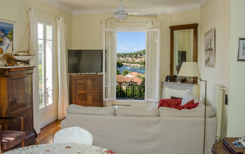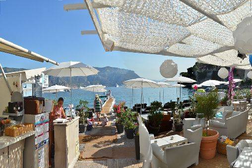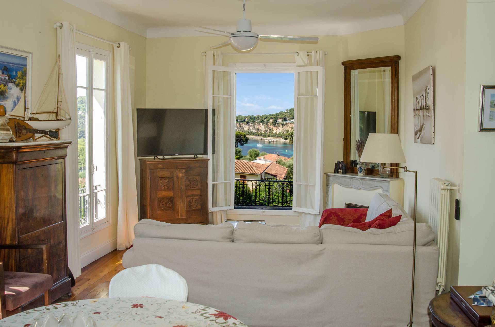 Grand séjour/salle à manger donnant sur les plages des Fosses & des Fossettes, le Cap-Ferrat, la Pinède de la Pointe de St. Hospice.