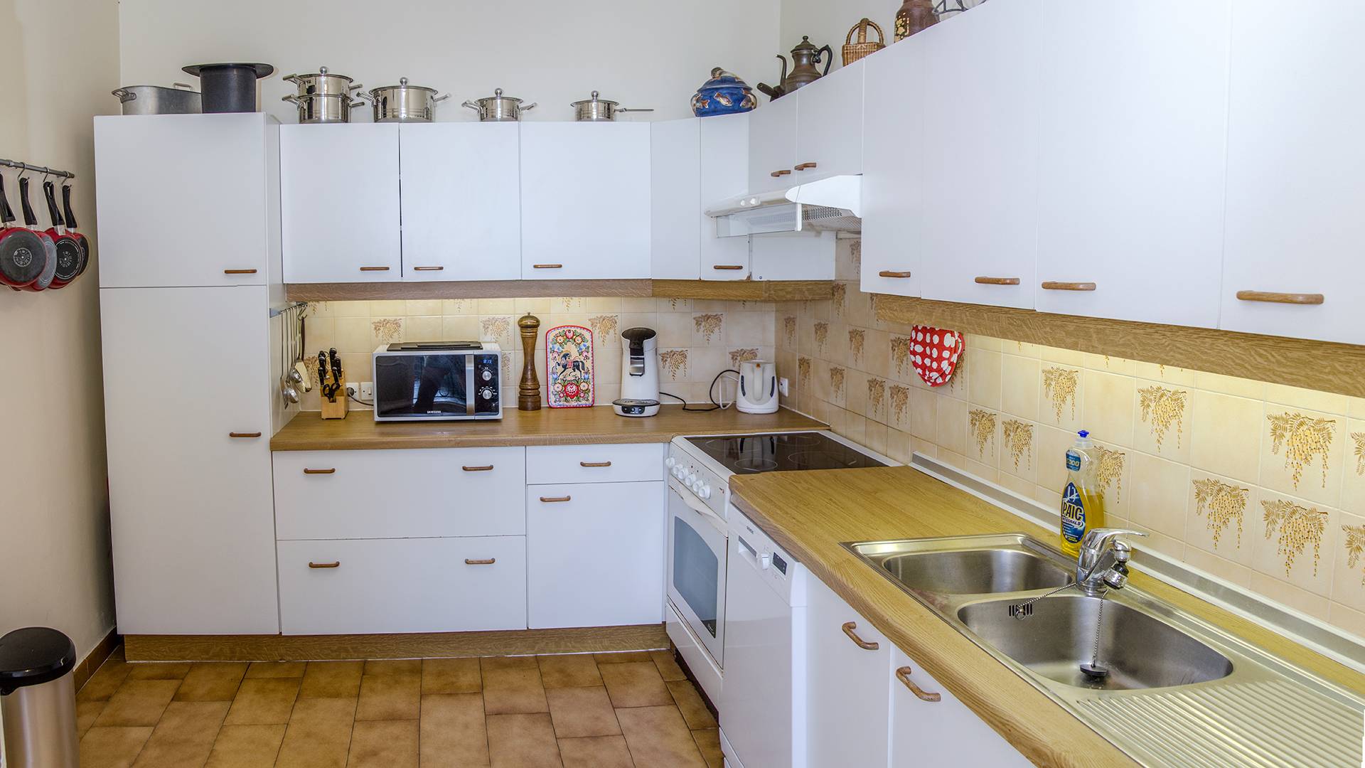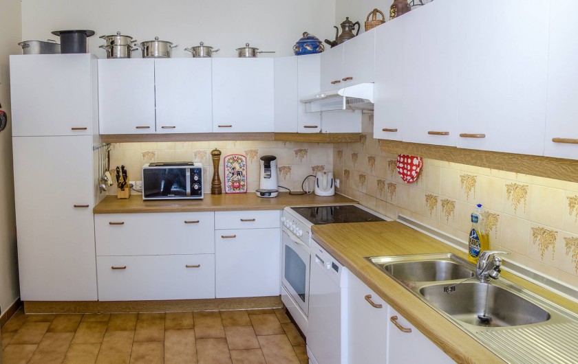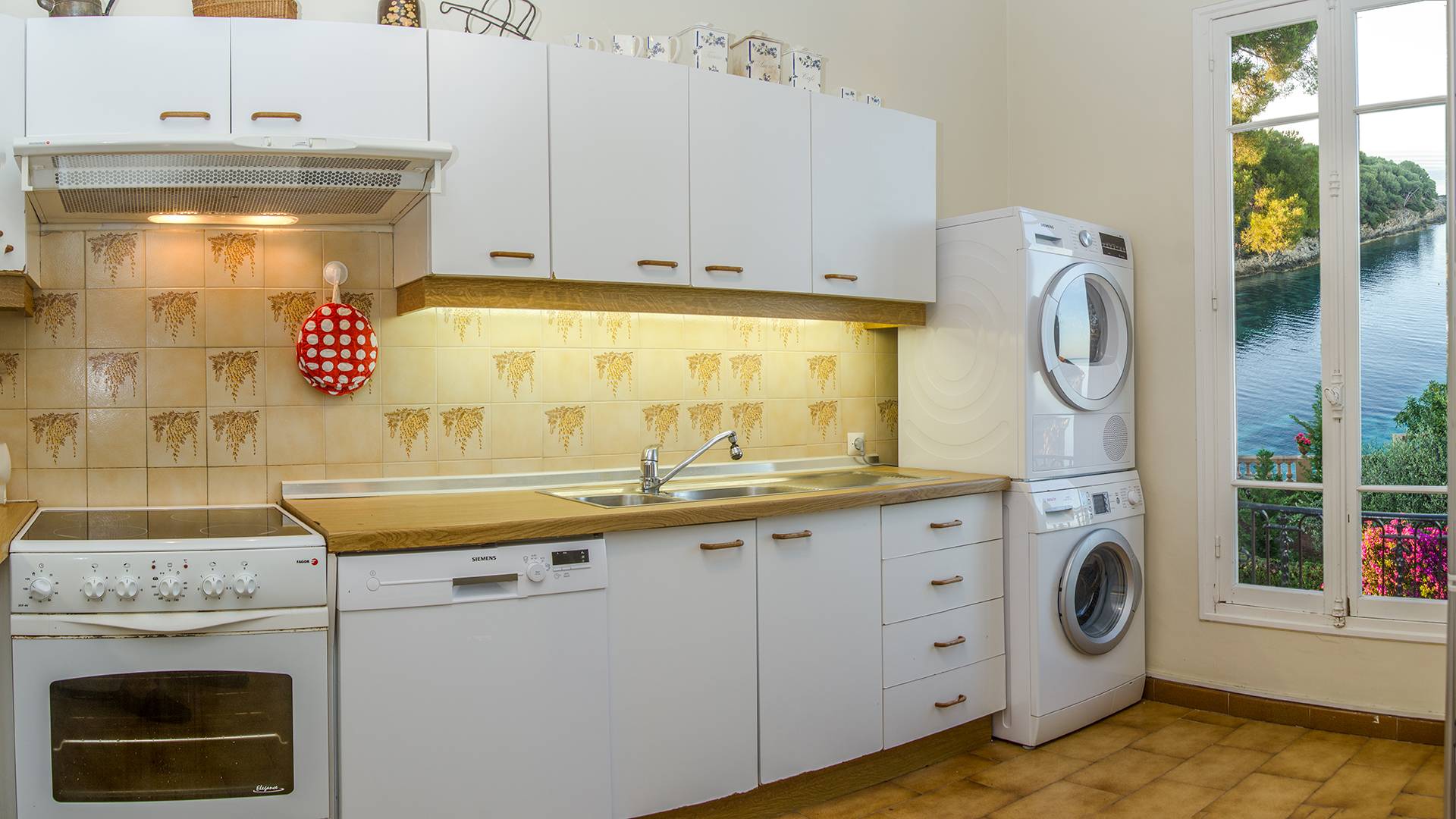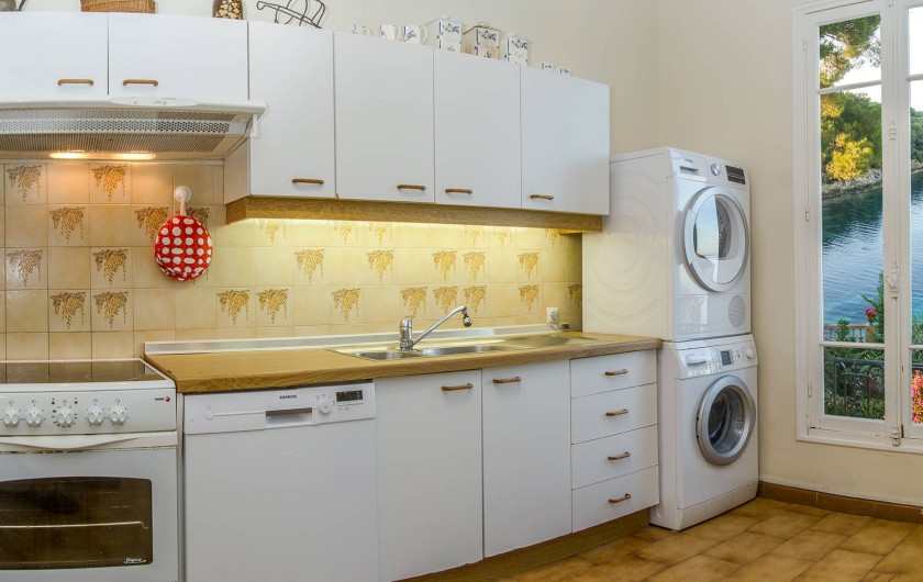 Large cuisine full équipée avec vue mer (lave-vaisselle SIEMENS, four, 4 plaques, micro-ondes, robot, réfrigérateur avec congélateur, lave-linge BOSH, sèche-linge SIEMENS, etc.)