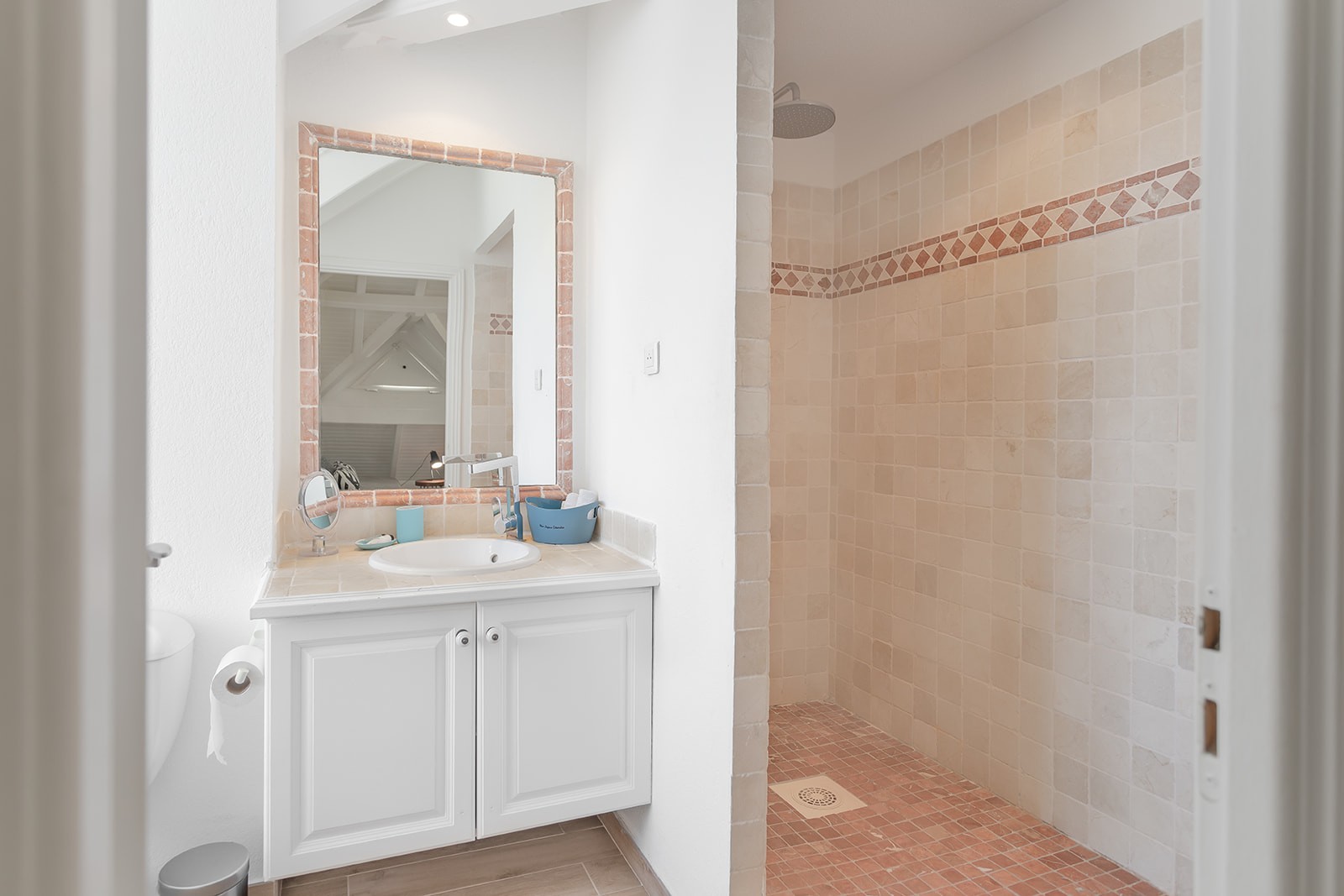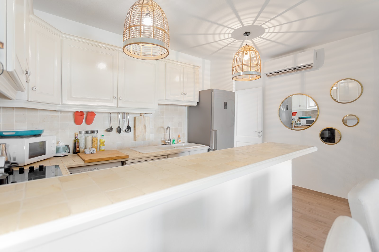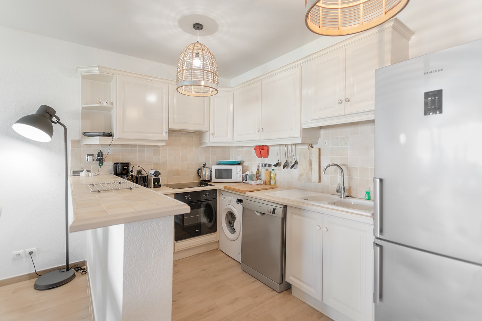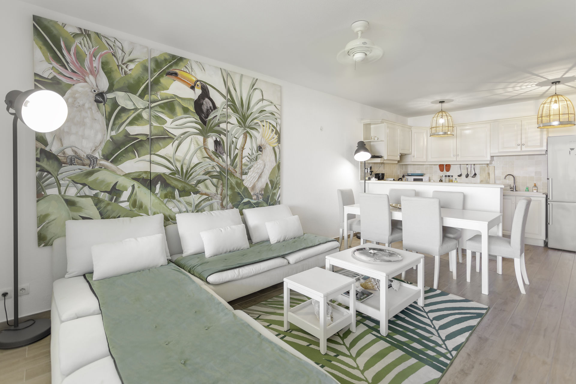 Au 1er niveau la cuisine toute équipée s'ouvre sur le salon/salle à manger décoré avec soins dans une ambiance tropicale.