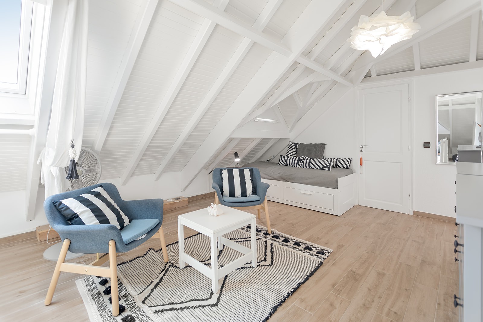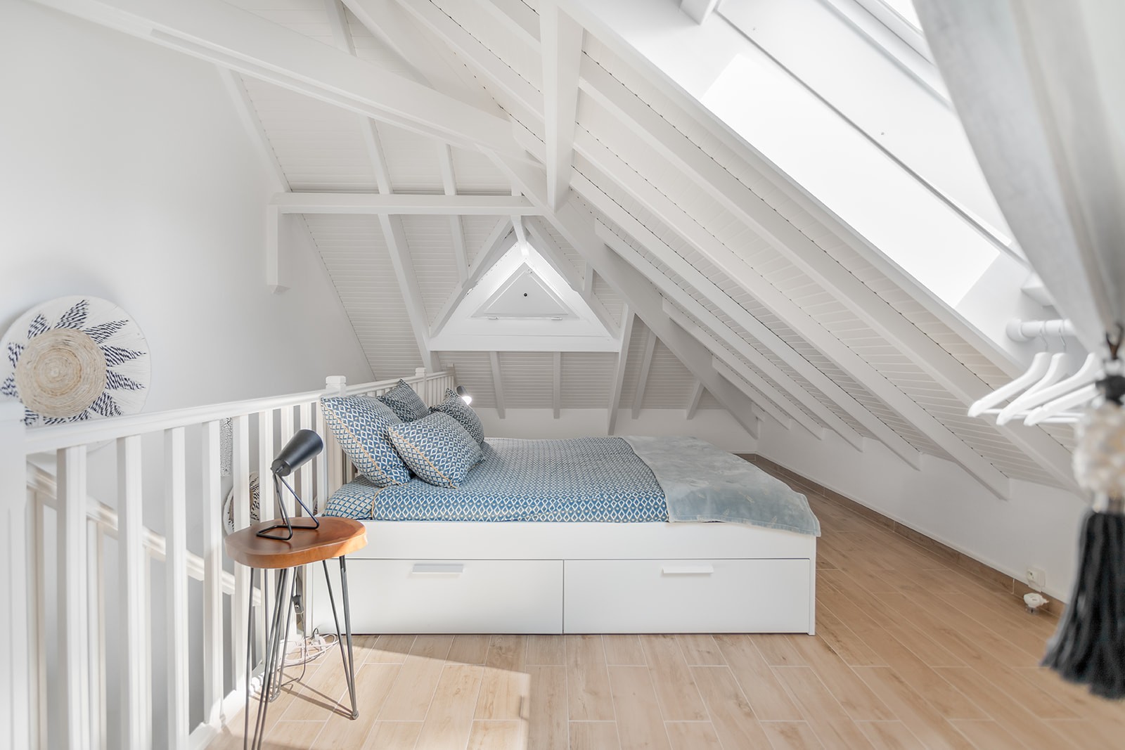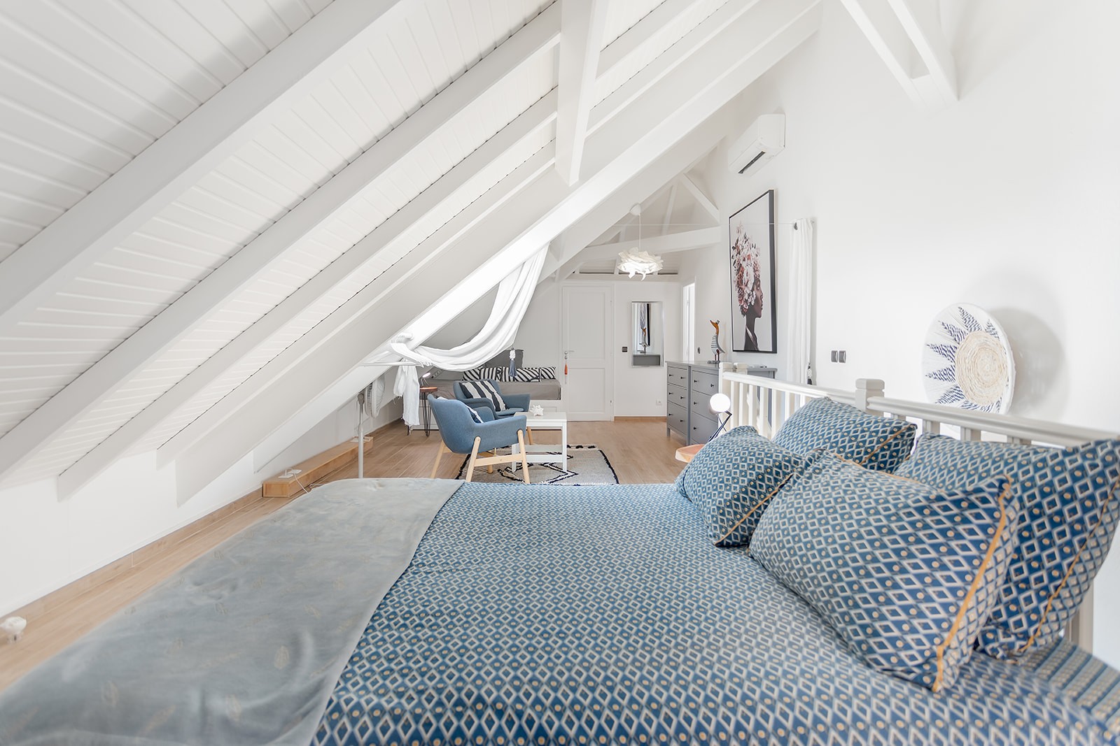 Il dispose d'une chambre avec lit King size et salle de bain en-suite au 1er niveau et d'une 2ème chambre semi-ouverte en loft avec lit Queen size, un coin salon avec canapé-lit et une salle de bain avec WC.