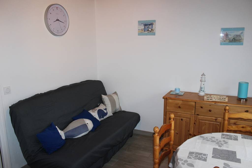 Un salon avec coin cuisine (plaque vitro, micro-onde, four, hotte, machine à laver, lave vaisselle), canapé lit et TV