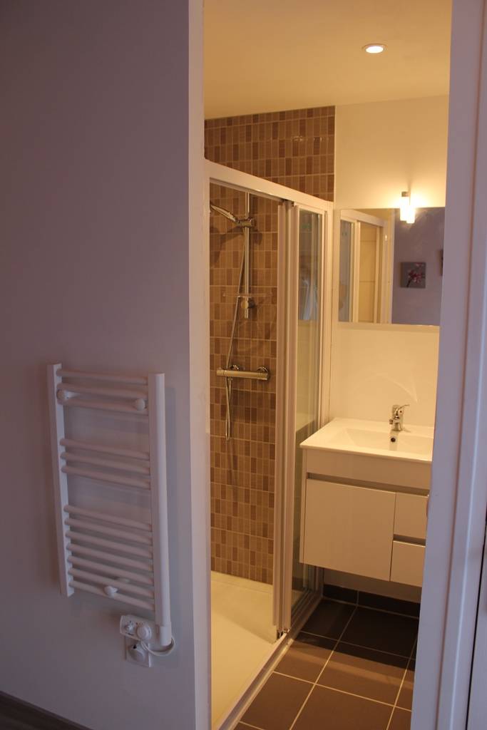une chambre avec un lit double, une salle de bain avec une douche spacieuse, WC séparé.