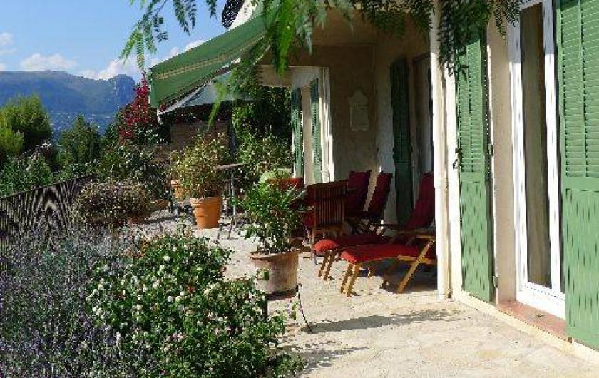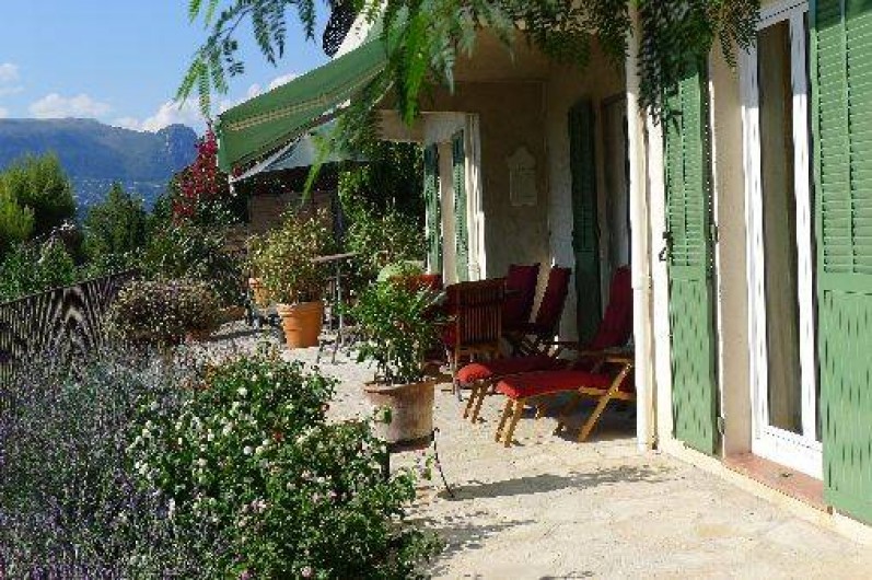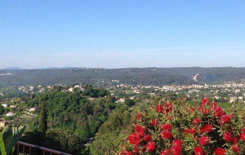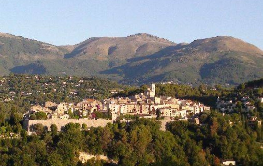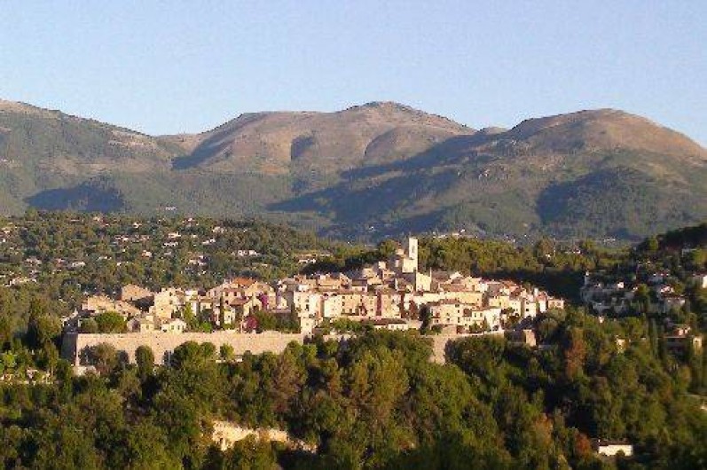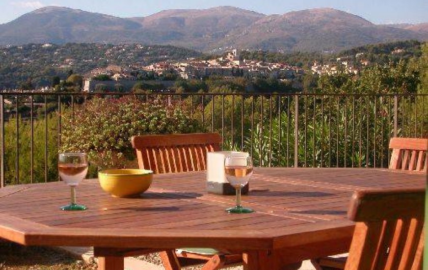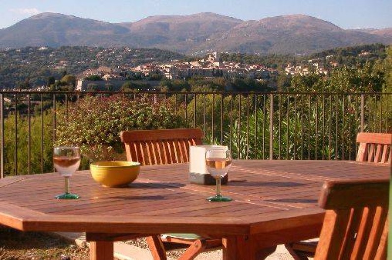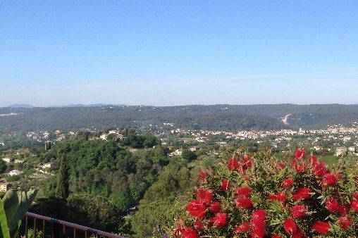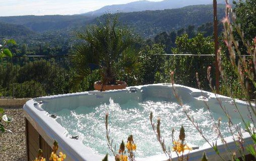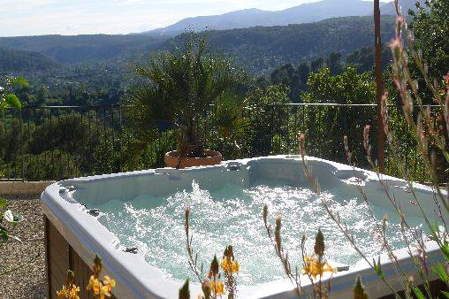 Location d'un grand appartement complètement indépendant et privatif avec vue panoramique sur Saint-Paul-de-Vence et les montagnes. Large terrasse avec barbecue et un Spa pour 5 personnes. 15 minutes de l’Aéroport de Nice.