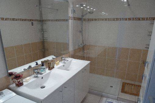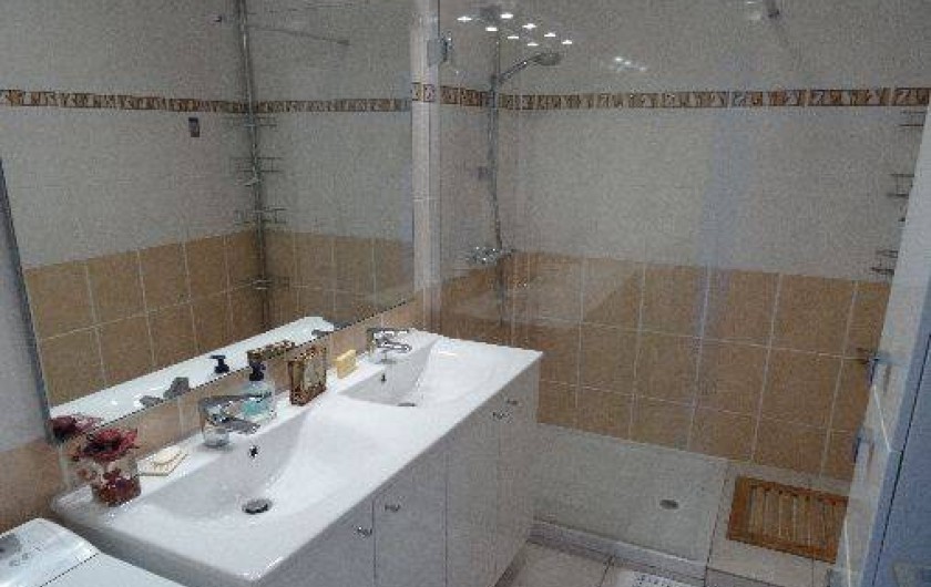 - Une salle d'eau avec douche et lavabo double vasque