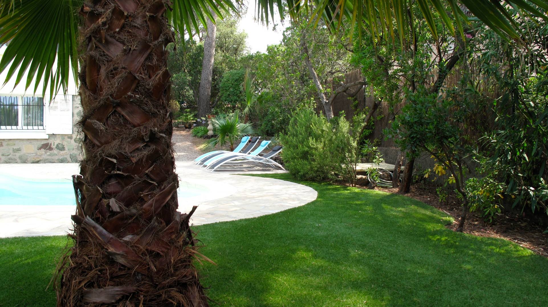Superbe appartement climatisé (3*) 2 pièces pour 2/3 personnes avec belle terrasse et barbecue, dans villa organisée en 2 appartements indépendants sur 2 niveaux sur jardin paysagé clôturé, accès libre piscine et bains de soleil, quartier résidentiel de Boulouris, place de stationnement gratuite.