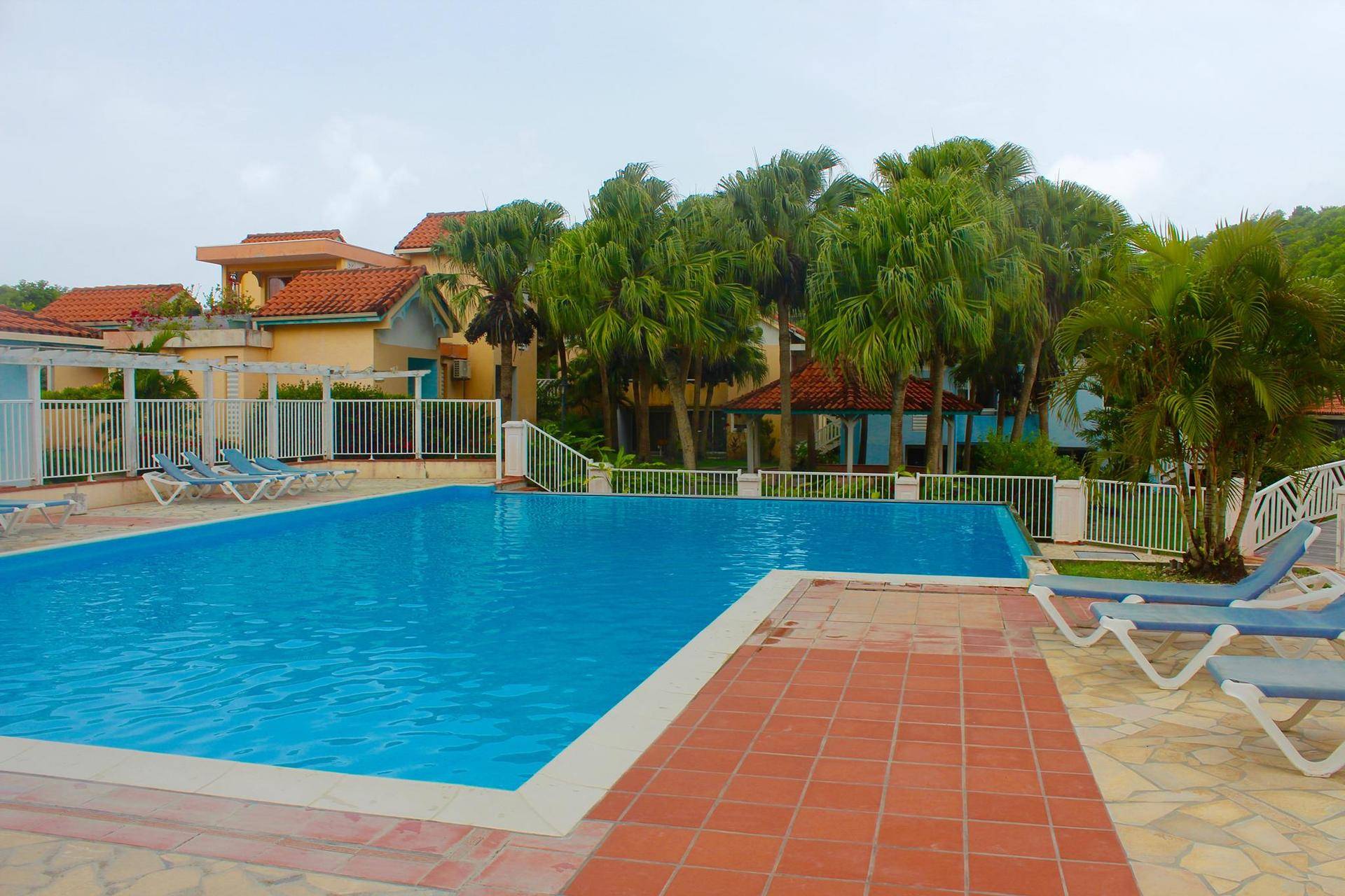 excursions, randonnées équestres, kayak etc... Mais la résidence, elle-même est réputée pour son calme et sa tranquillité. Elle est clôturée, il y a un parking ouvert à l'entrée et à l' arrière. Des animations dans la journée et en début de soirée autour de la piscine viennent tout de même vous rappeler l'esprit de convivialité qui y règne. L'appartement de type T2 est au rez-de-jardin. Il est composé de deux terrasses; l'une située à l'avant, l'autre située à l'arrière donne sur une petite savane. L'appartement est entièrement équipé : une cuisine avec four électrique et plaques chauffantes, un four micro-ondes, cafetière, un mixeur de légumes et fruits, un réfrigérateur, un congélateur, un barbecue. Le salon spacieux et agréable est équipé d'un ventilateur; de deux lits gigognes servant de canapé, d'une télévision et d'un lecteur DVD. Vous trouverez à votre disposition des draps et des serviettes dans la chambre qui est climatisée. C'est dans un cadre enchanteur que vous passerez vos vacances avec une prise en main dès votre arrivée à l'aéroport si vous le souhaitez.