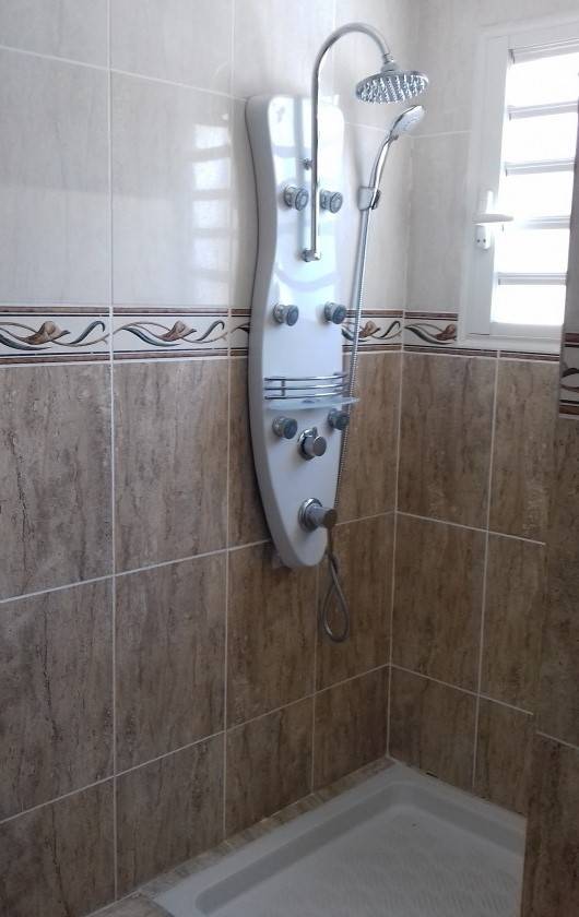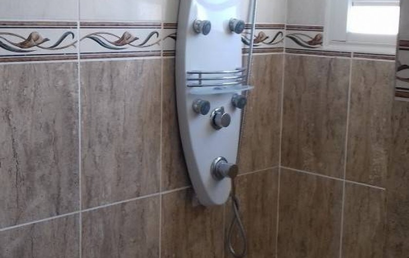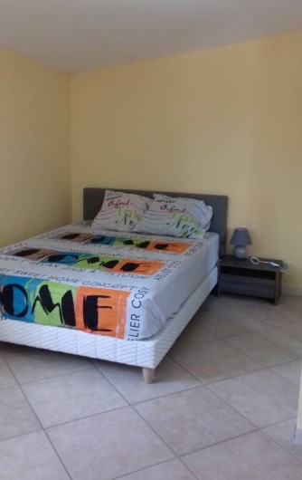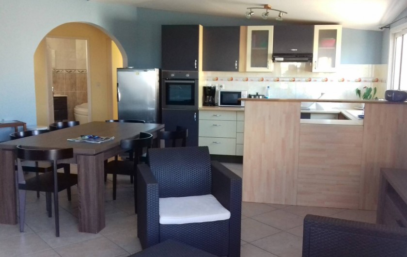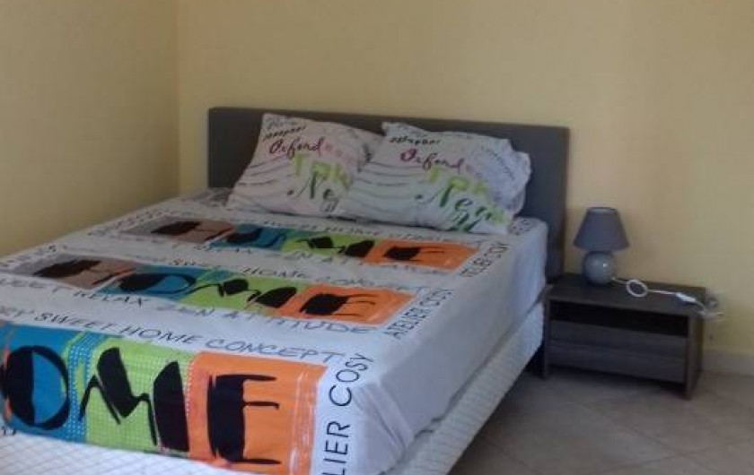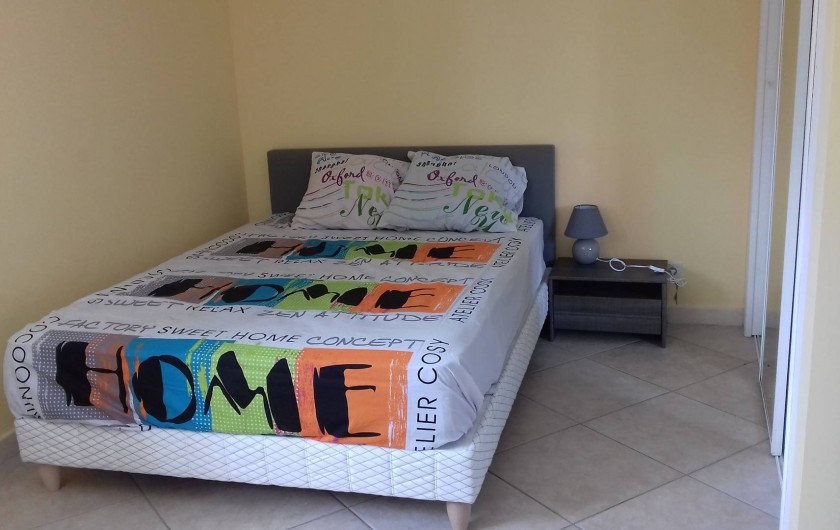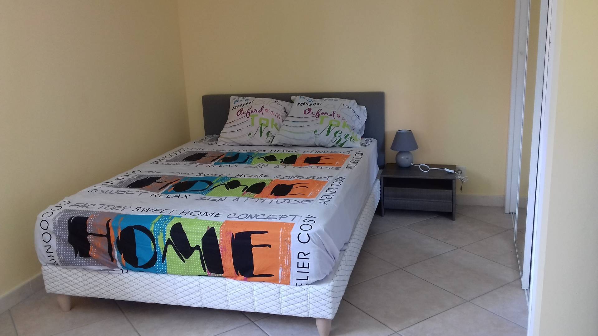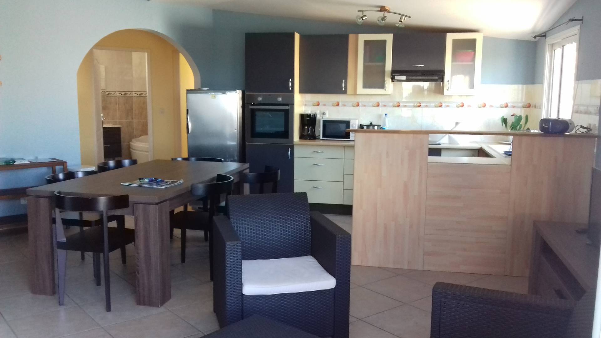 Appartement avec terrasse vue mer, cuisine ouverte, 3 chambres avec chacune un lit double, et une salle de bain avec douche + baignoire.