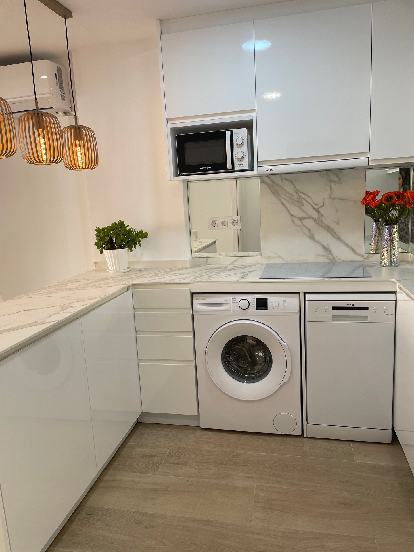 Cocina con todos los electrodomésticos: vitrocerámica, frigorífico, lavadora, microondas, exprimidor, cafetera, batidora, tostadora, batería, cubiertos, vajilla, etc. papel de cocina.