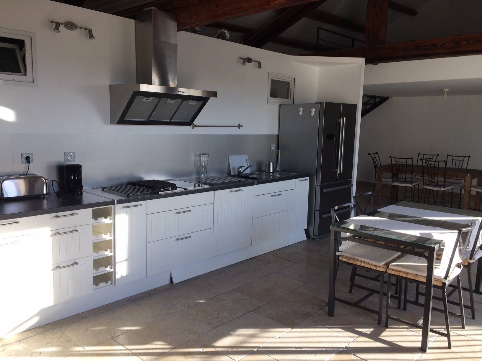 GRAND ILOT CENTRALE MODULÉ avec cuisine américaine entièrement équipée avec plaque à induction, four, lave-vaisselle, grille-pain, cafetière, bouilloire électrique, micro-ondes, réfrigérateur/congélateur, 1 salle de bain avec baignoire balnéo, 1 WC indépendant, machine à laver, WI-FI. Grands placards de rangement.