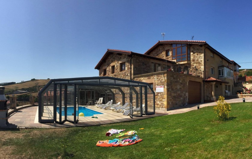 La maison dispose d'une piscine climatisée, jardin, barbecue et un salon commun avec des livres, des jeux, et cheminée.
