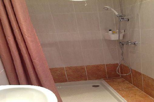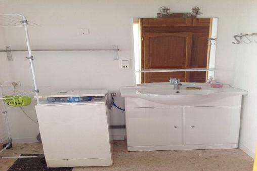 -1 salle de douche avec lavabo et toilettes, grand rangement, coin buanderie avec lave linge et étendoir.