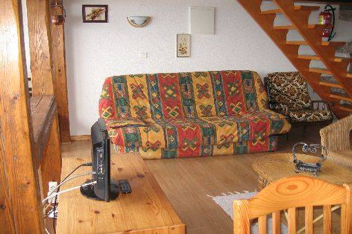 ANEMONE: une grance pièce avec coin repas (four, plaque de cuisson, réfrigérateur, micro-onde, vaisselle) un coin repas, un coin salon avec canapé convertible (140x190) et à l'étage une mezzanine avec armoire de rangement et deux lits 1 personne (90x190 chacun) et lit bébé, et une salle de douche avec lave-linge.