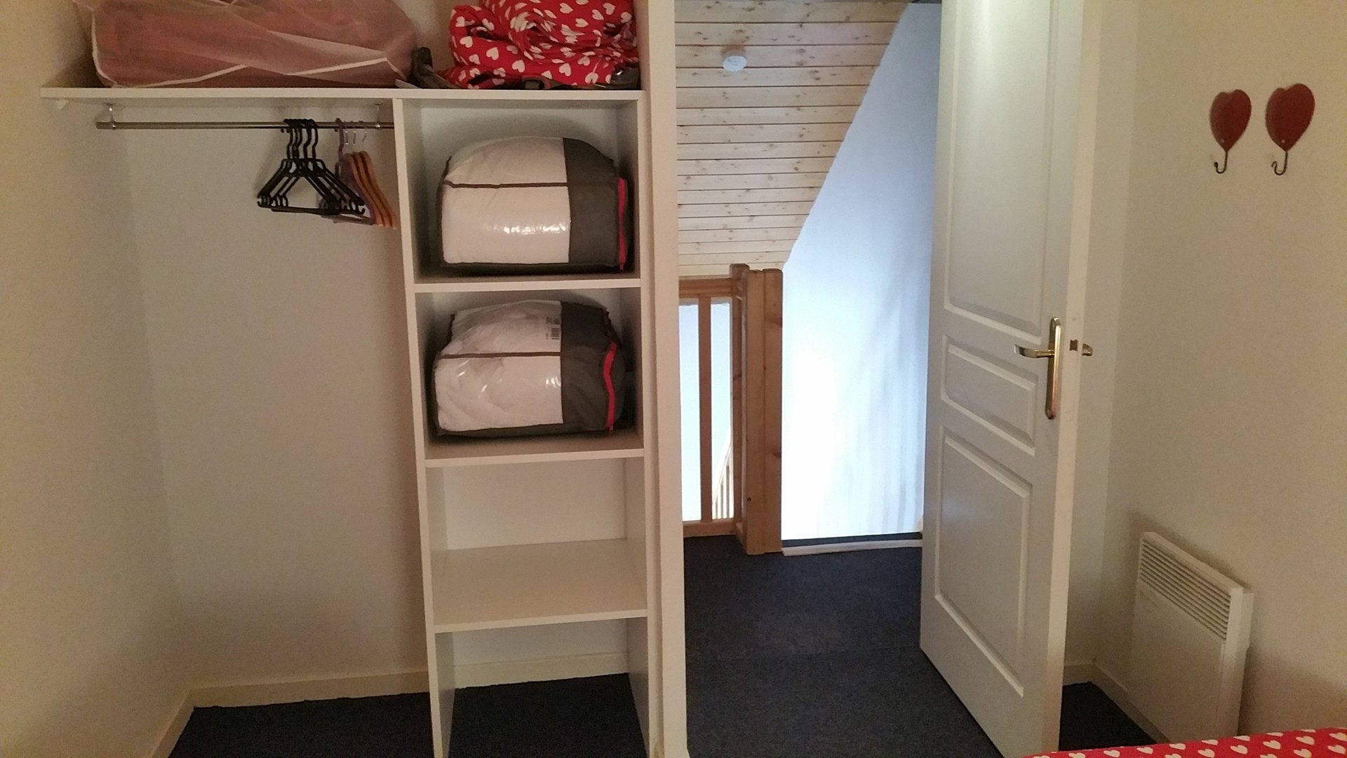 _ Etage accessible par escalier partant du salon : Une petite chambre du renard avec grands rangements et 2 lits . Une grande chambre du lynx penderie , armoire , 2 lits , salle de bains - wc attenante . Balcon vue montagne .