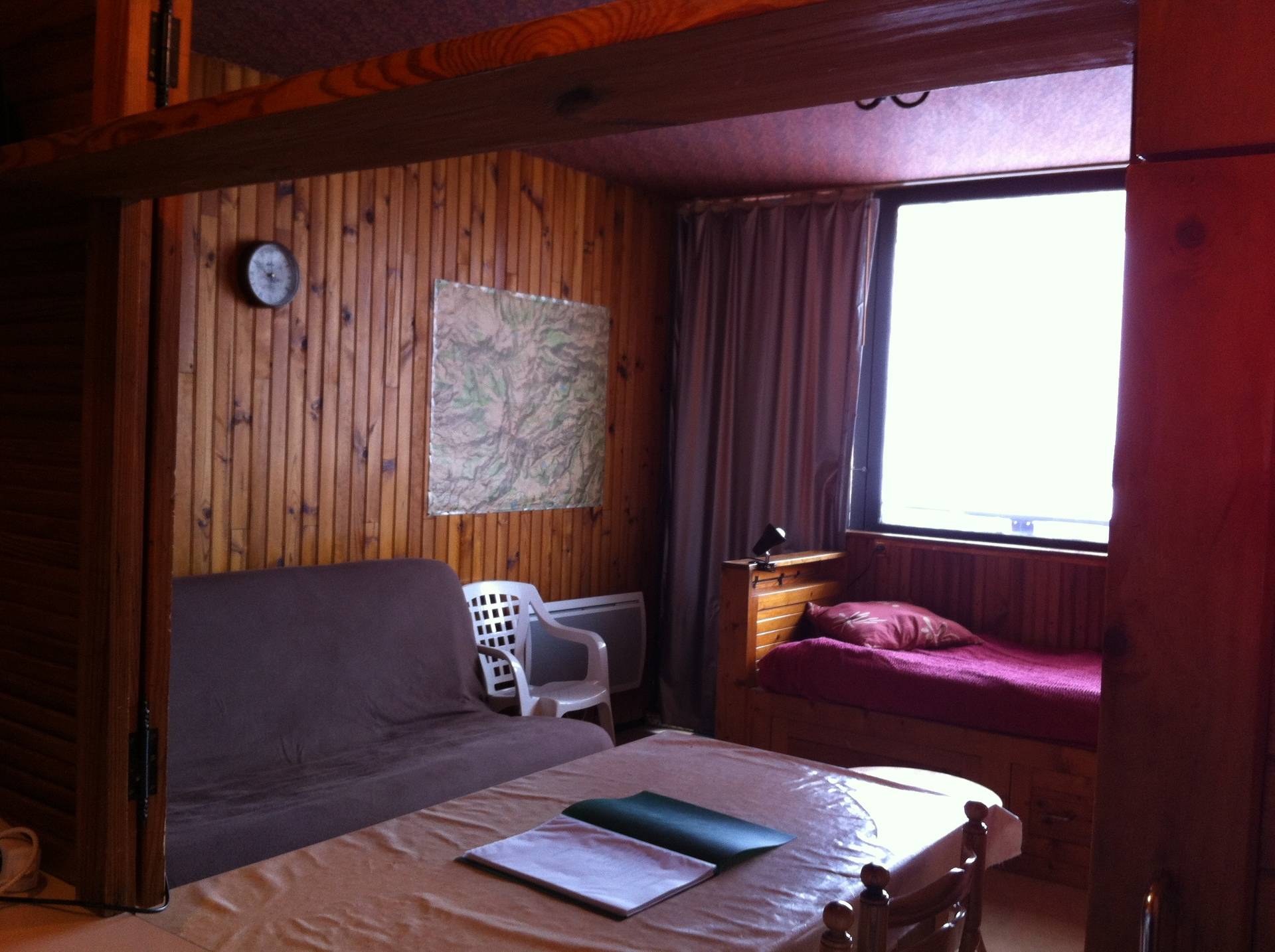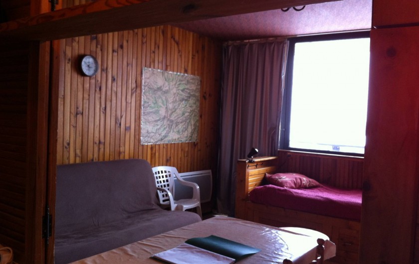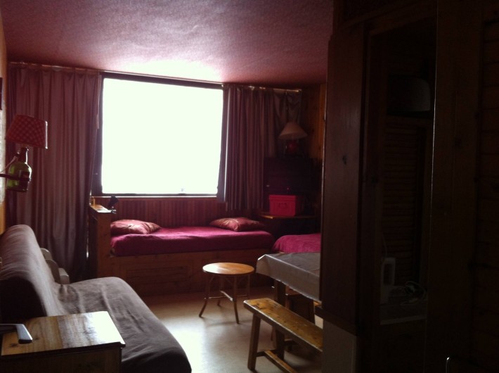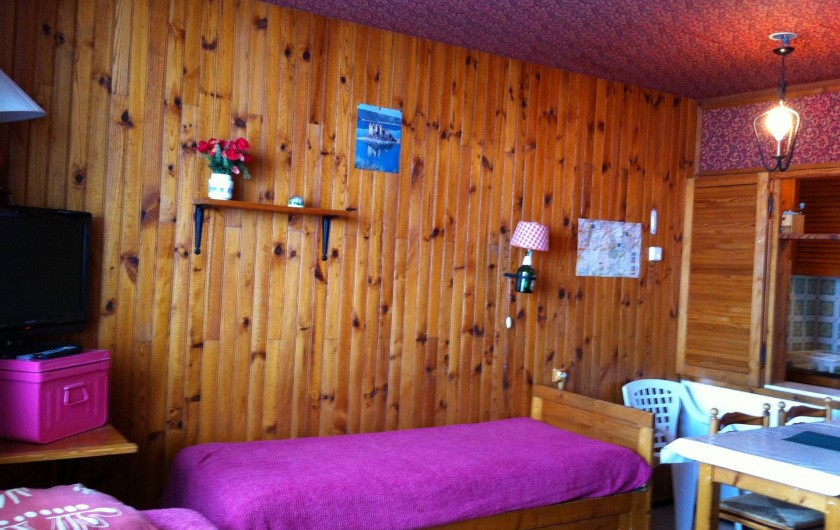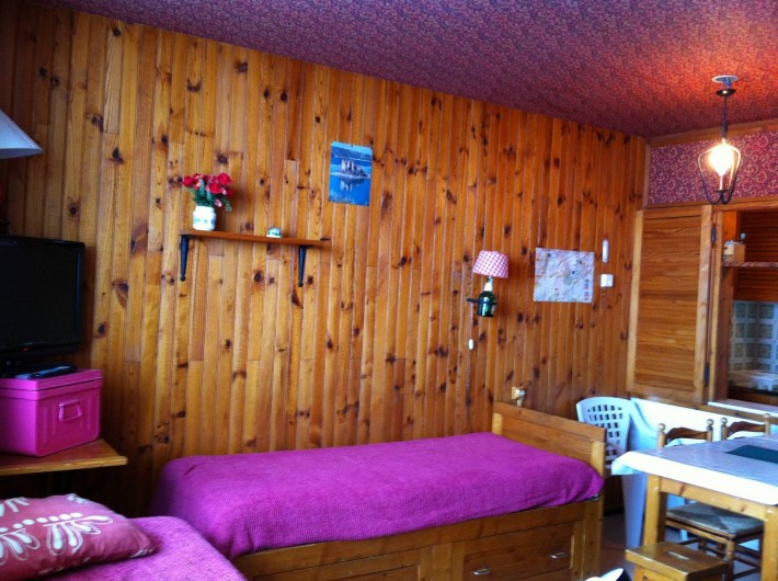 - salle de séjour avec un clic-clac double et deux lits une personne sur tiroirs + table