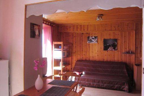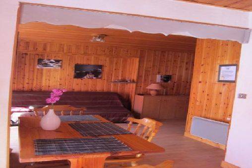 Un appartement de style montagnard avec une chambre individuelle et trois couchages, un coin séjour avec un couchage pour deux personnes, service hôtelier gratuit (lits fait à votre arrivée); un grand balcon exposé sud ouest, situé au 1er étage. La garderie pour les enfants se trouve en face de l'appartement ainsi que le départ des navettes.