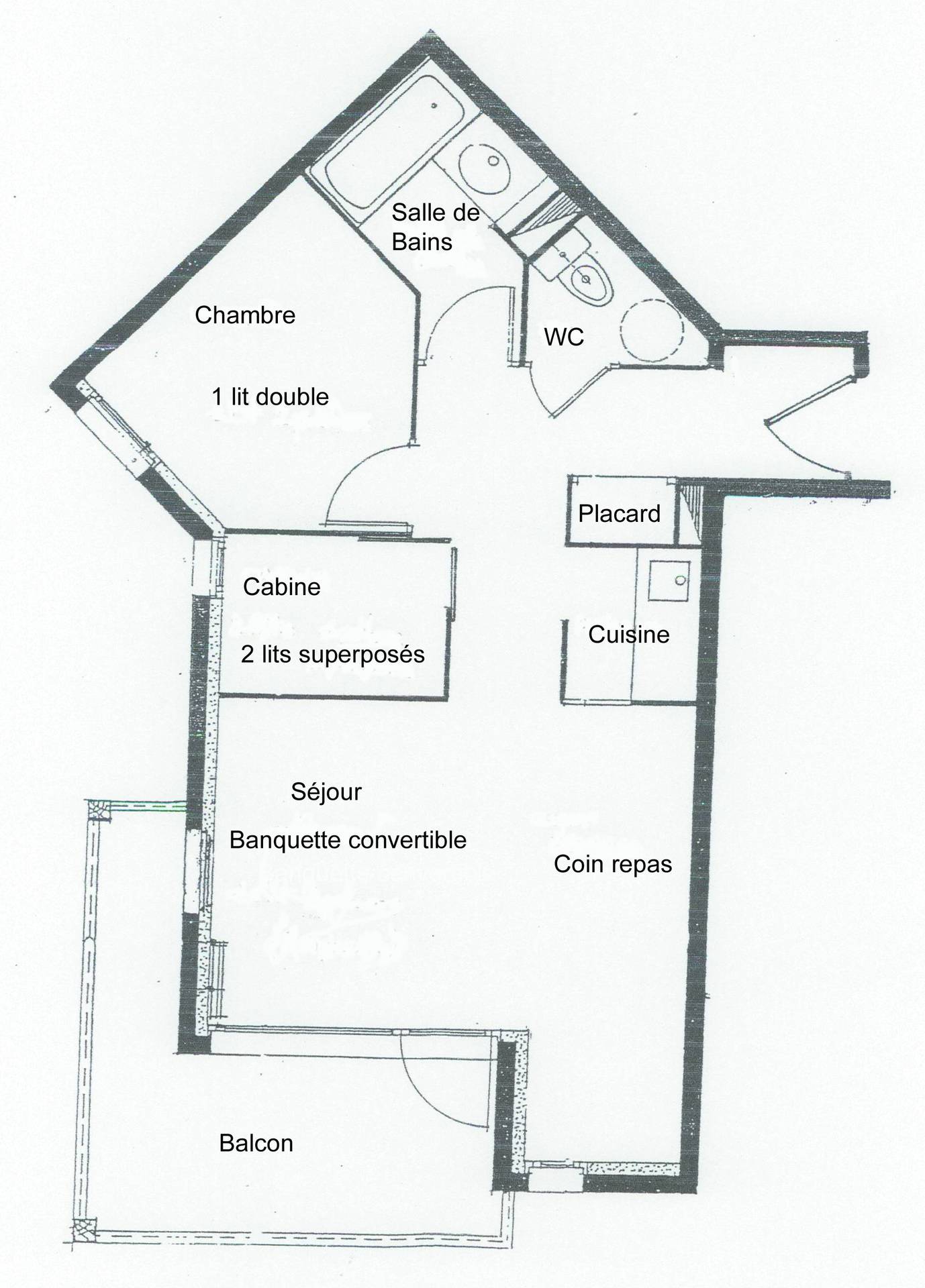 Deux chambres indépendantes proposent 1 lit double pour l'une et des lits superposés pour l'autre. Un convertible dans le séjour permet d'accueillir 2 personnes également, indépendamment du coin repas et de la kitchenette équipée. Les WC sont indépendants de la salle de bain et il existe de nombreux rangements dans ces 35 m2 agréablement décorés.