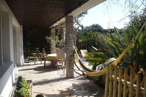 La terrasse jardin arborée (30m²) est aménagée d'un salon de jardin avec chaises longues et hamac. Elle est clôturée pour les jeunes enfants.