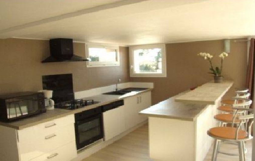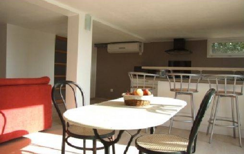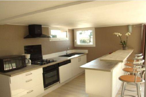 Cuisine américaine entièrement équipée, deux chambres dont une avec un lit en 140 et l’autre de deux lits de 90, rangement dans les deux chambres (possibilité de prêt d’un lit parapluie pour bébé).