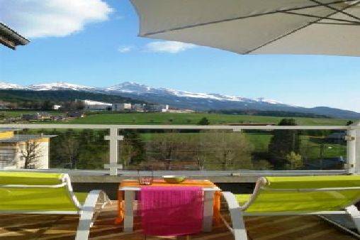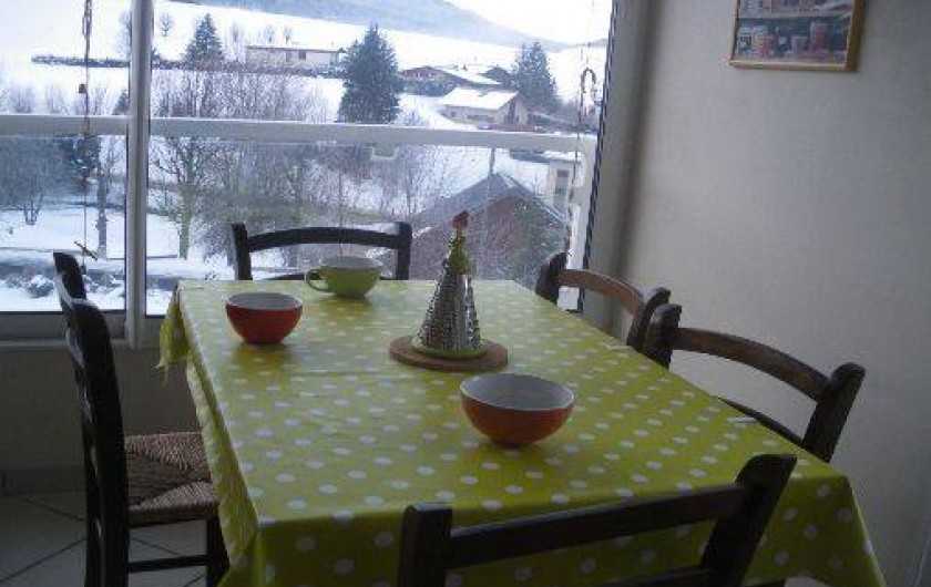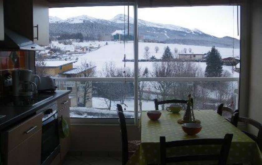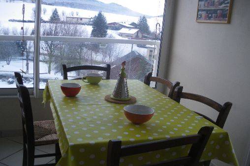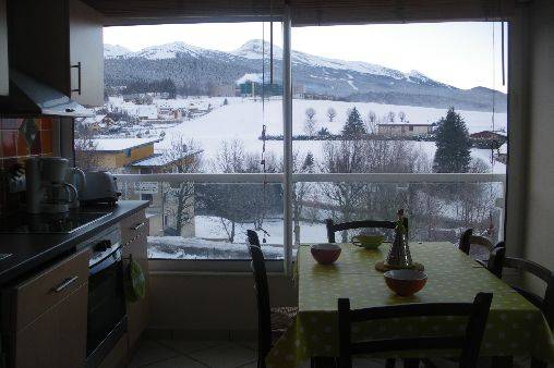 Cuisine plein sud, toute équipée, avec grande baie vitrée et porte vitrée donnant sur terrasse plein sud face aux montagnes; salon avec canapé convertible 2 places très confortable, télévision TNT, téléphone portable.