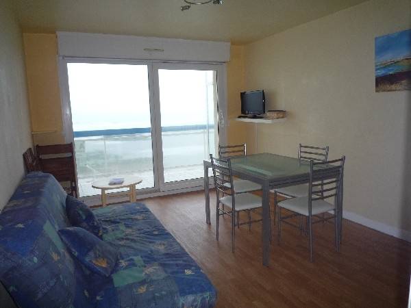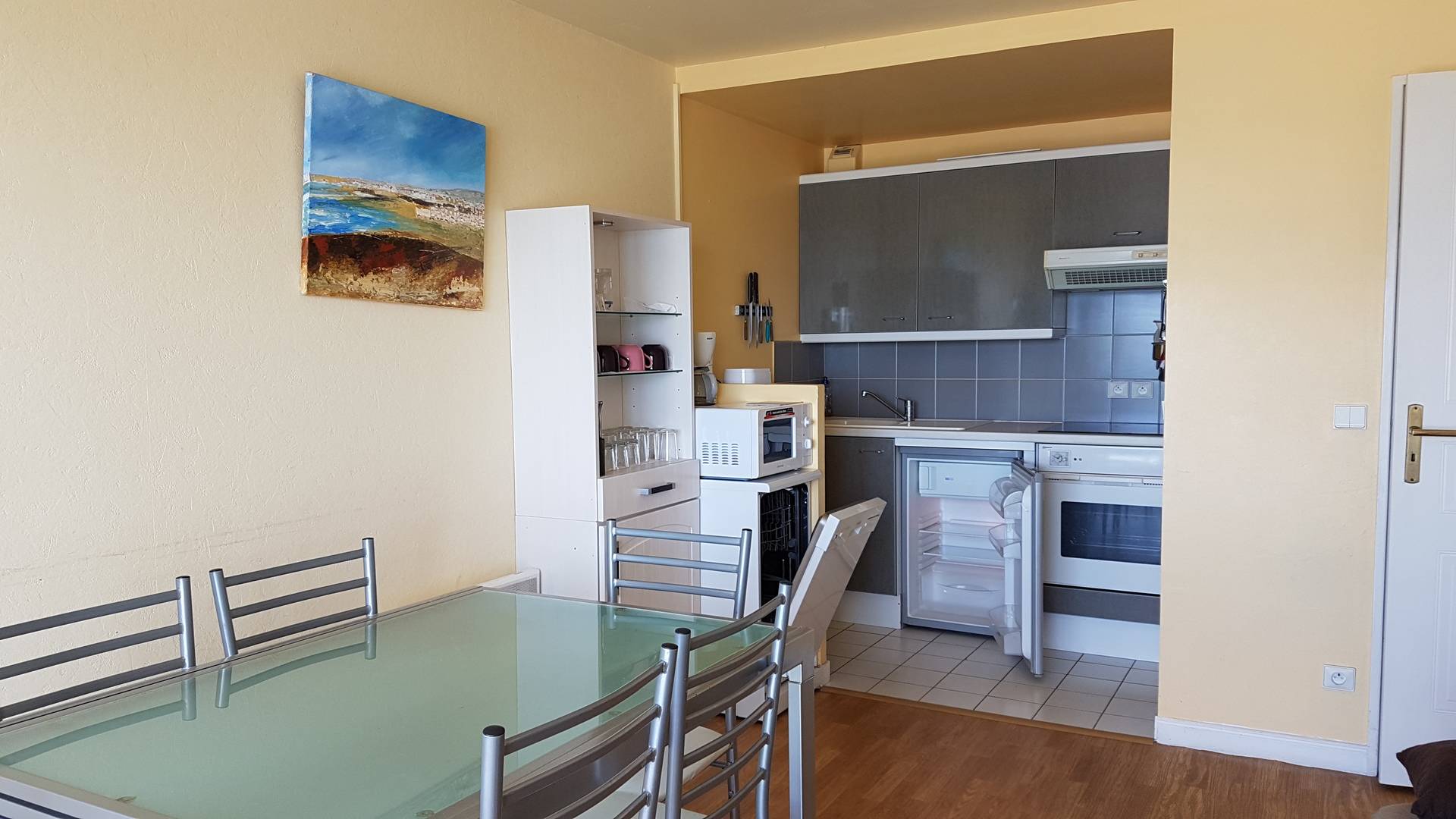 salle de séjour clic clac pour 2 couchages donnant sur cuisine équipée