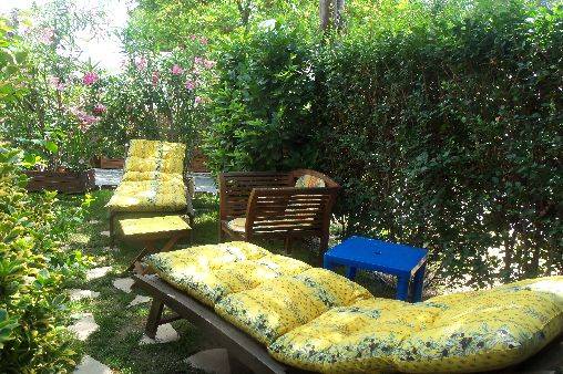 entouré de LAURIERS ROSES ou 2 bains de soleil en teck Avec MATELAS vous attendent pour le farniente et la bronzette en toute tranquillité.
