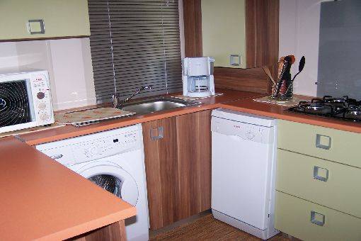 cuisine avec télé écran plat,lecteur de dvd,radio,une plaque de cuisson 4 feux gaz,un mini-four,un micro-onde,un lave vaisselle,un lave linge,un réfrigérateur avec partie congélateur,une cafetière,une salle d'eau avec douche et lavabo,un wc séparé.