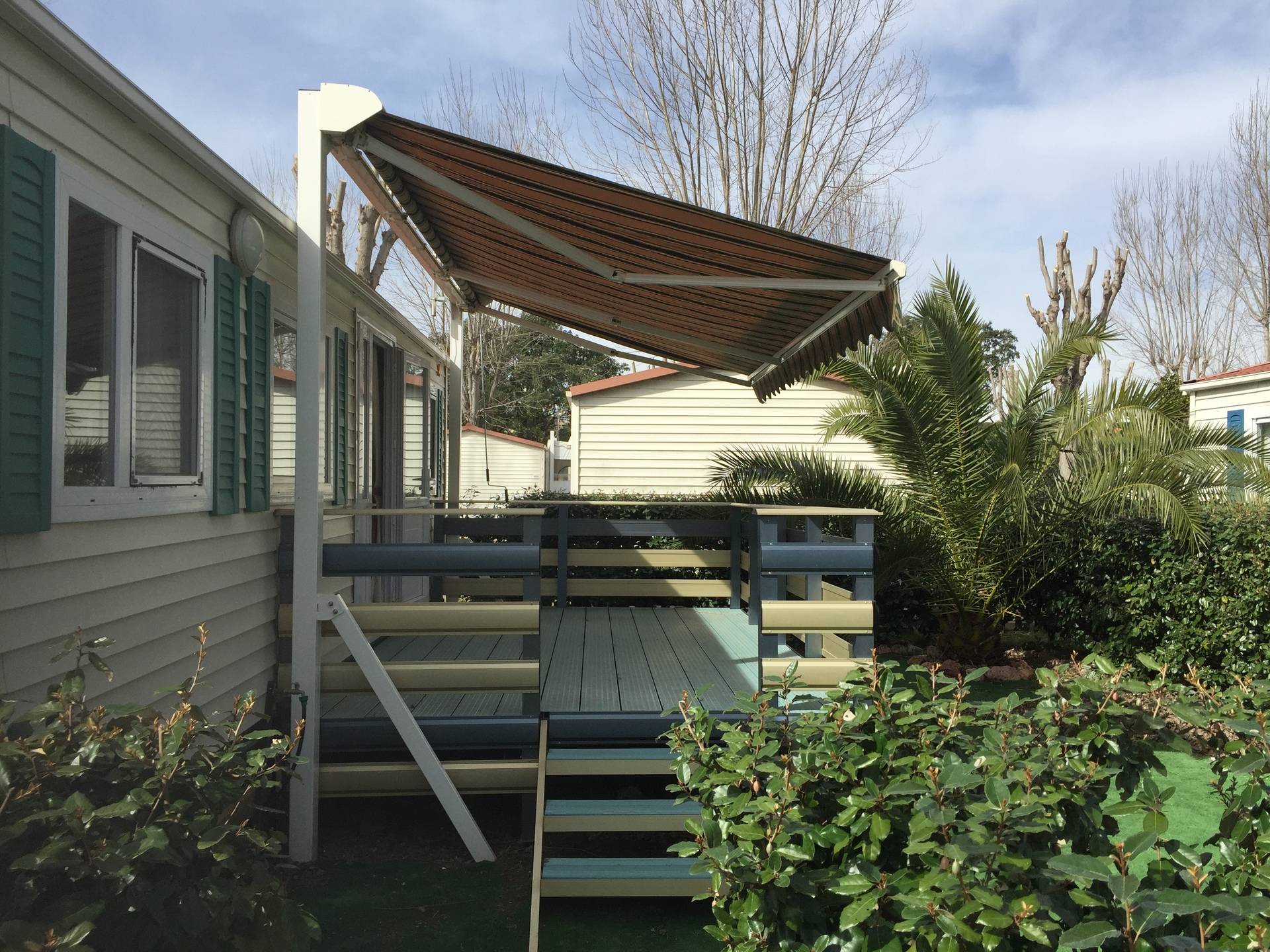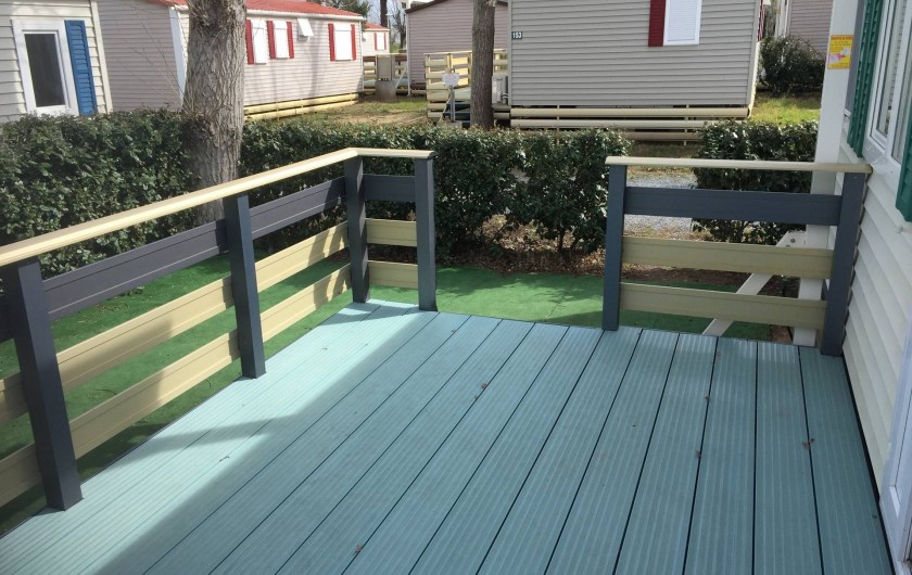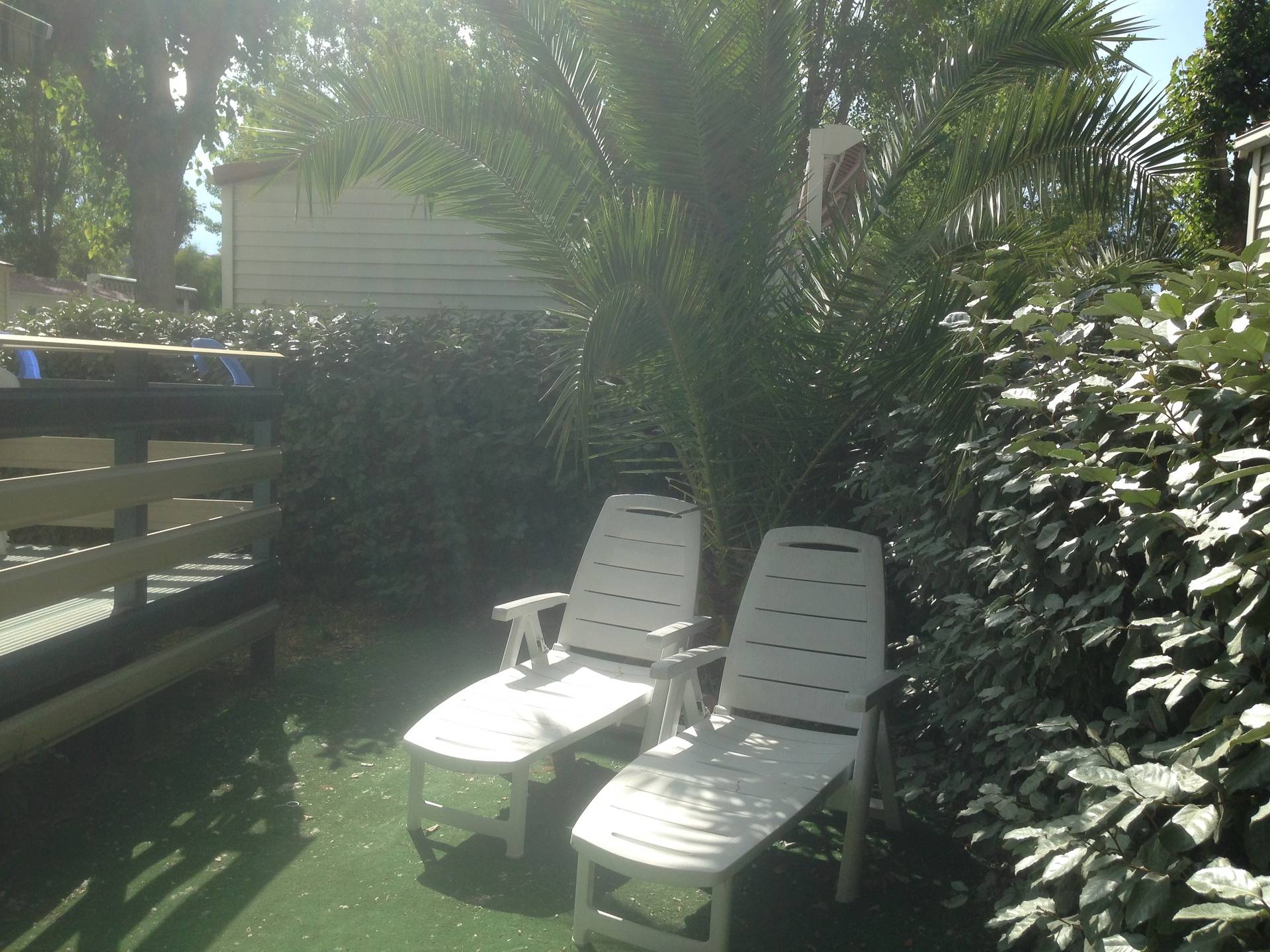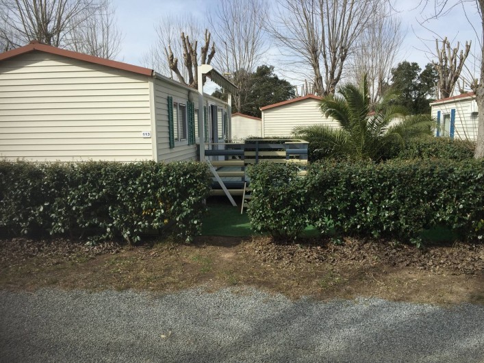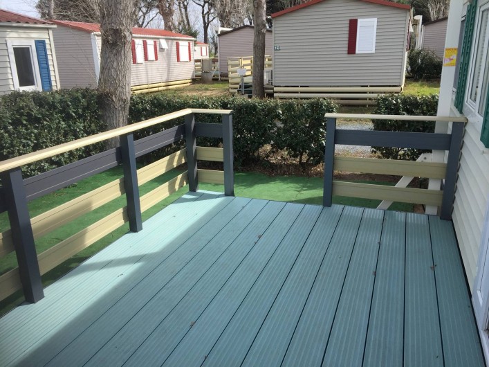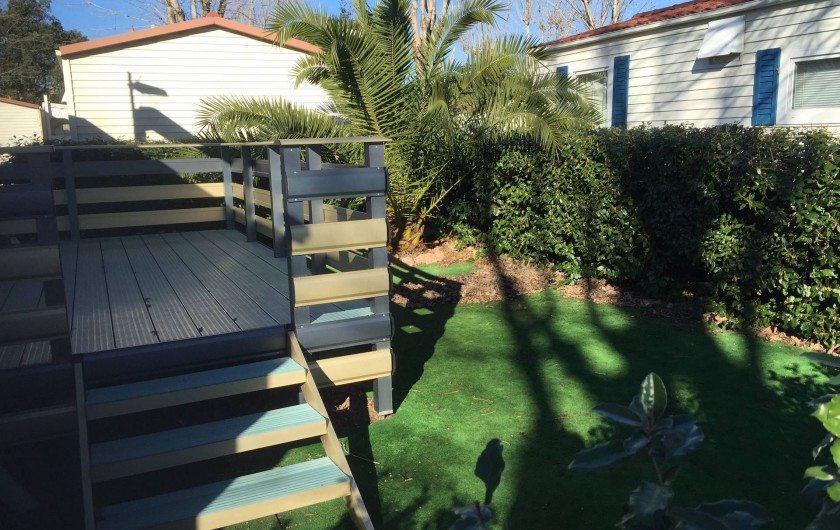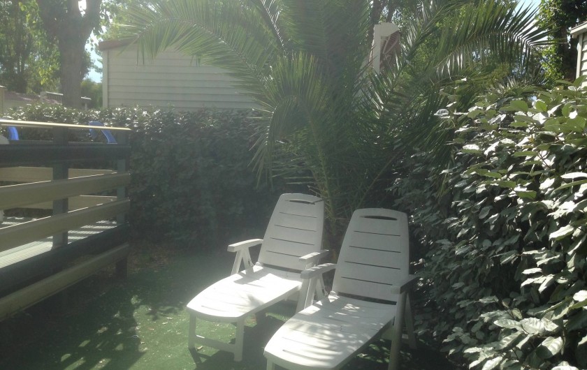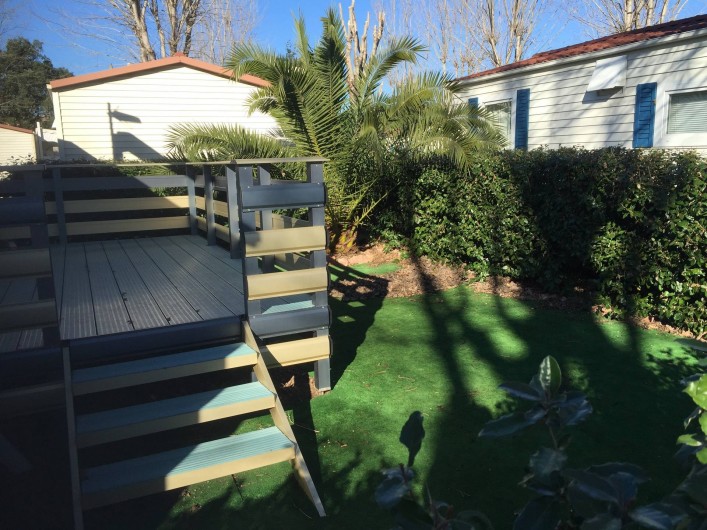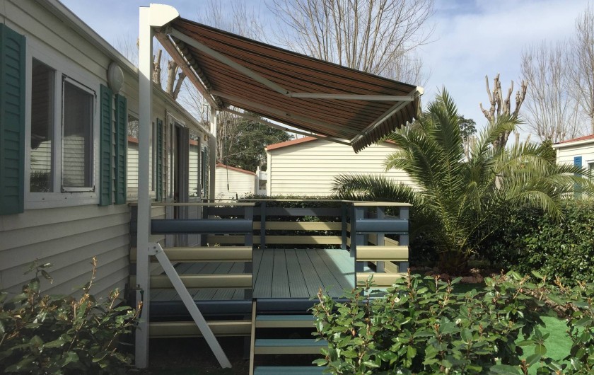 terrasse avec store,salon de jardin,transats,2 vélos adultes,jardin cloturé autour du mobil home par une haie.