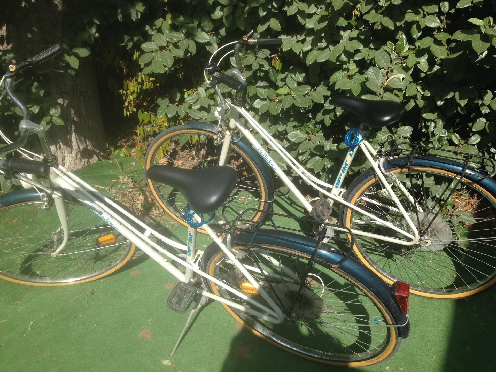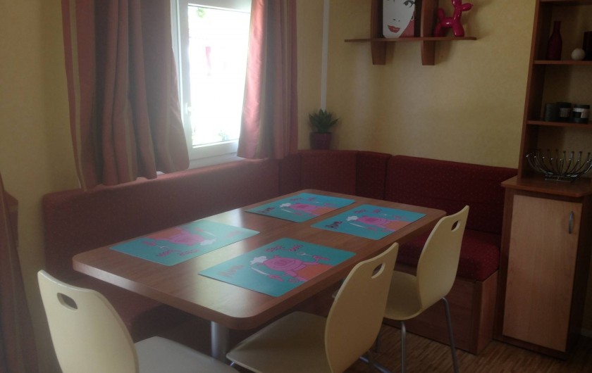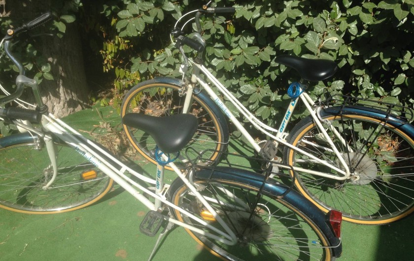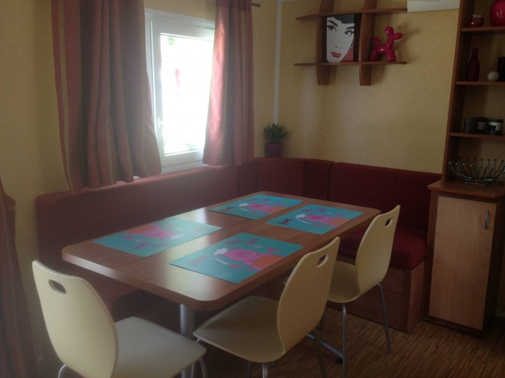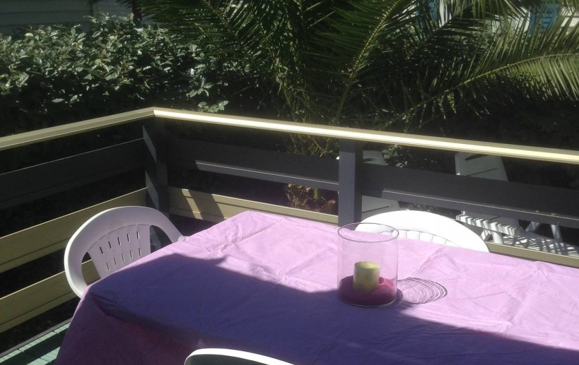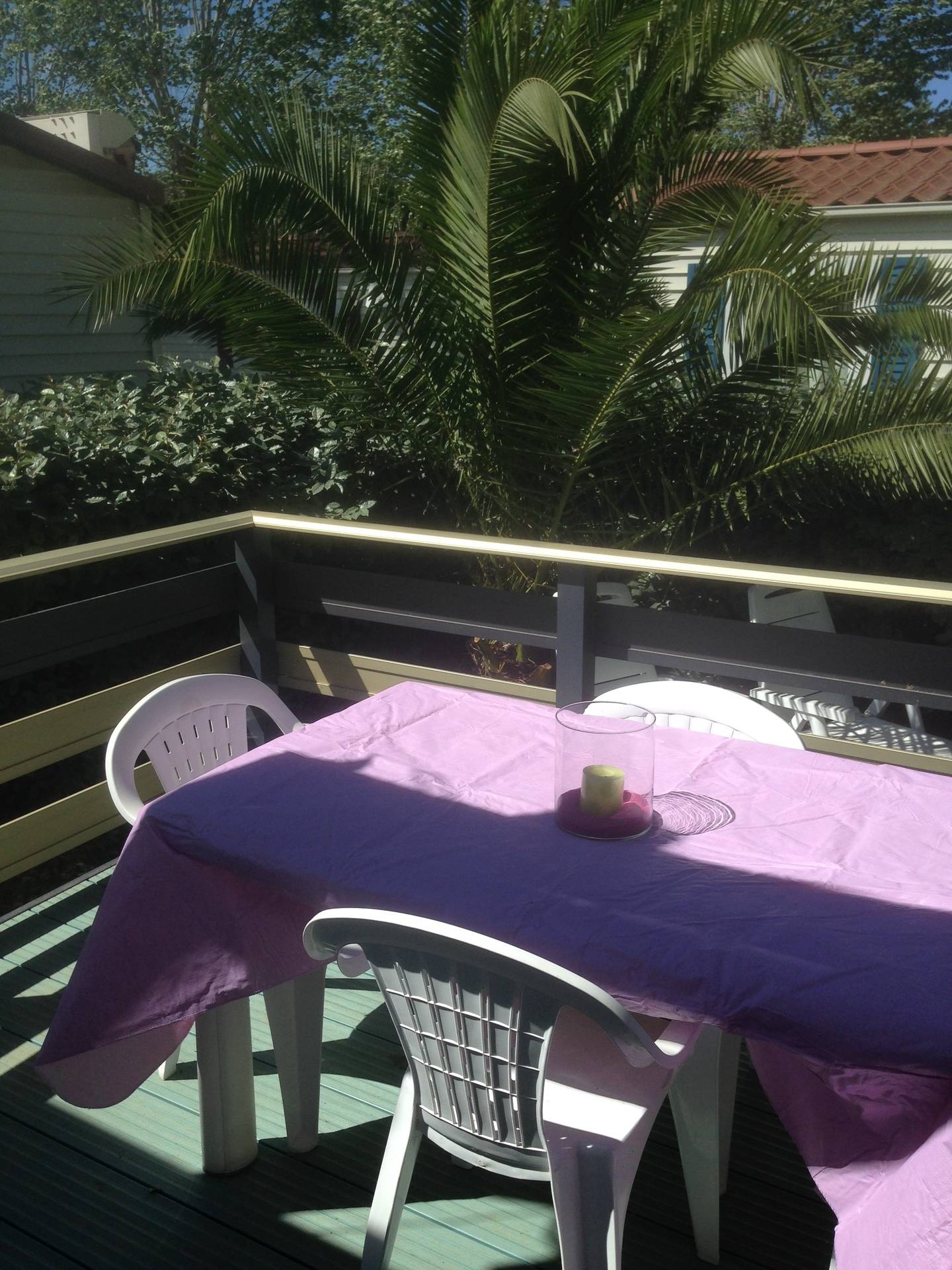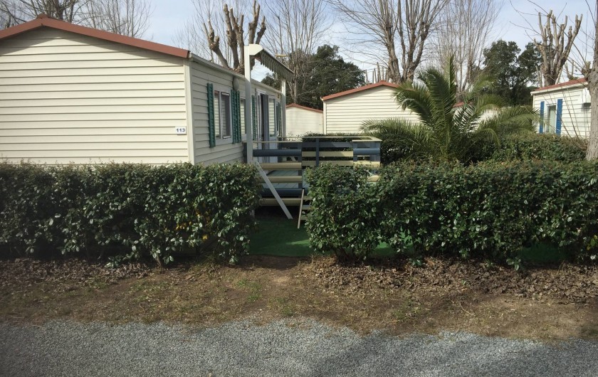 terrasse avec store,salon de jardin,transats,2 vélos adultes,jardin cloturé autour du mobil home par une haie.