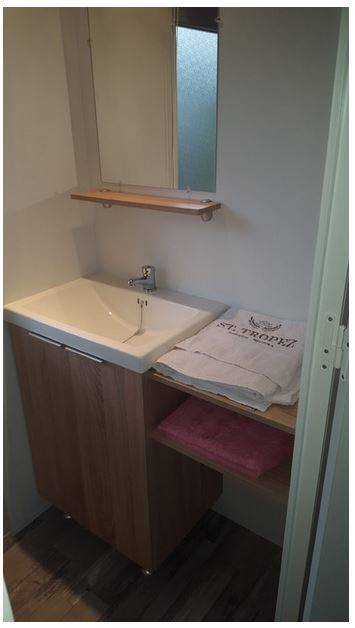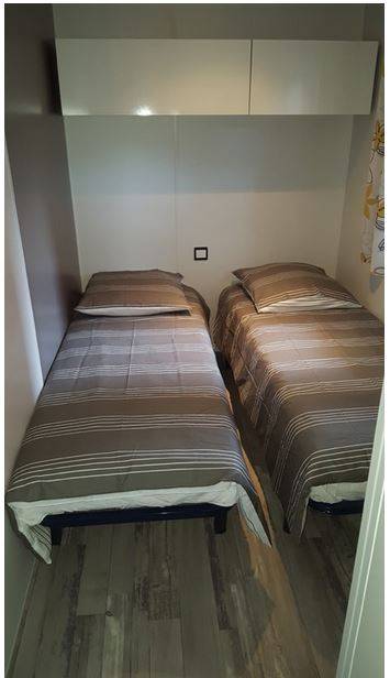 Le mobil-home comprend 2 chambres équipées chacune d’un lit 140×200 avec couette et oreillers et 2 chambres avec des lits une personne. Dans la première vous avez un lit gigogne et dans la seconde deux lits simples avec couettes et les oreillers également plus un canapé convertible 2 places dans le séjour.