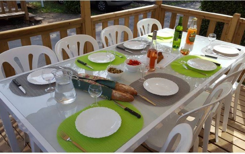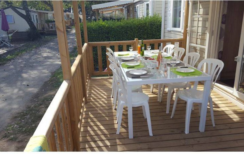 Afin que vous puissiez profiter pleinement de la terrasse, Planète Mobil Homes a équipé ses Mobil homes XXL d’une grande terrasse semi couverte avec une table de jardin de (220 x 100).
