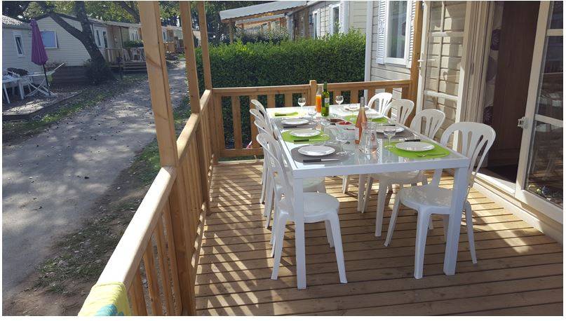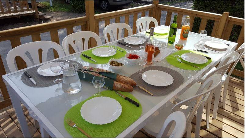 Afin que vous puissiez profiter pleinement de la terrasse, Planète Mobil Homes a équipé ses Mobil homes XXL d’une grande terrasse semi couverte avec une table de jardin de (220 x 100).