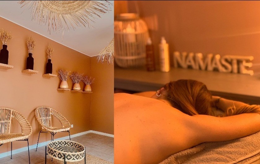 Une belle grande terrasse avec salon de jardin et transats, permettant d'accueillir de 1 à 6 personnes (enfants et bébés inclus).