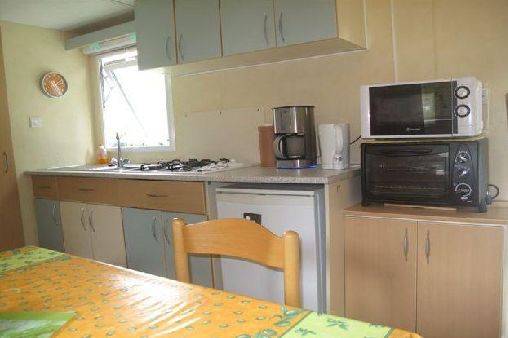 La cuisine du mobile home est équipée d'un four, d'un four micro-ondes et d'un réfrigérateur. Vous pourrez savourer