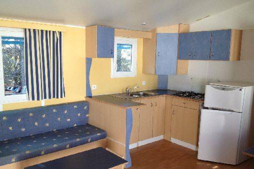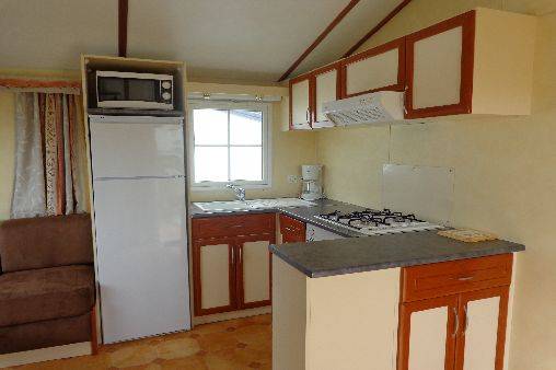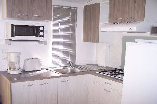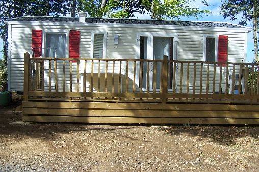 Nous louons des mobil homes qui sont composés de 2 chambres (1 chambre avec un grand lit et 1 chambre avec 2 petits lits), une banquette convertible, une cuisine équipée, un séjour, une salle de bains avec wc séparés. tous les mobil homes sont équipés d'une terrasse en bois et de vaisselle.