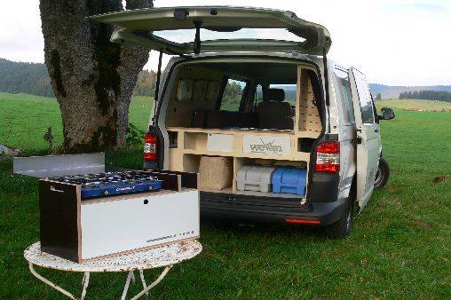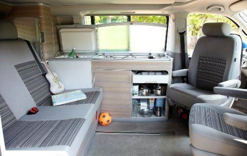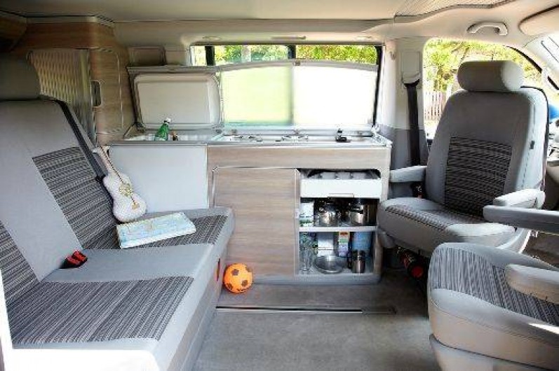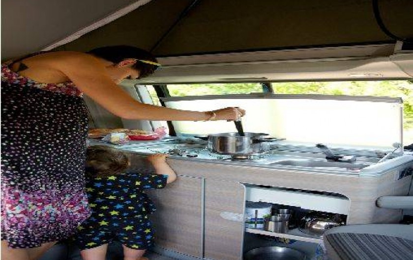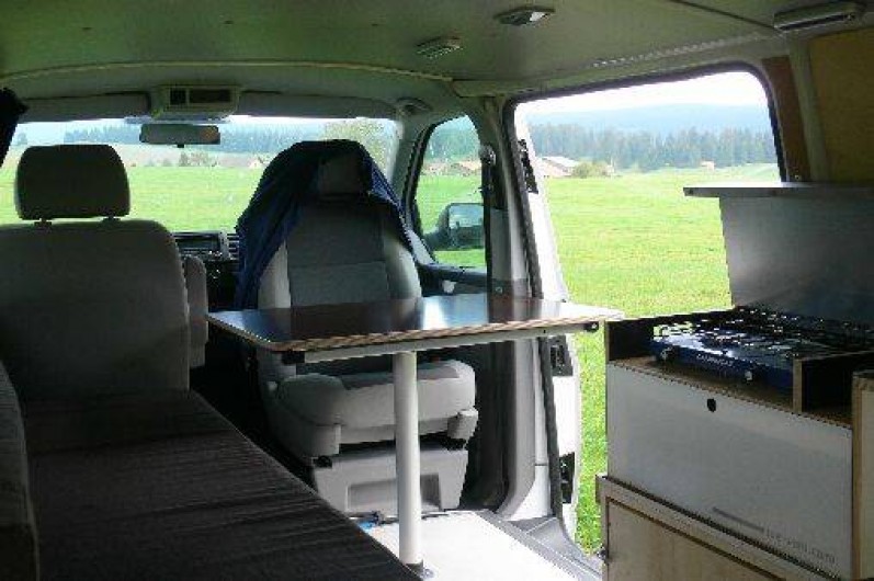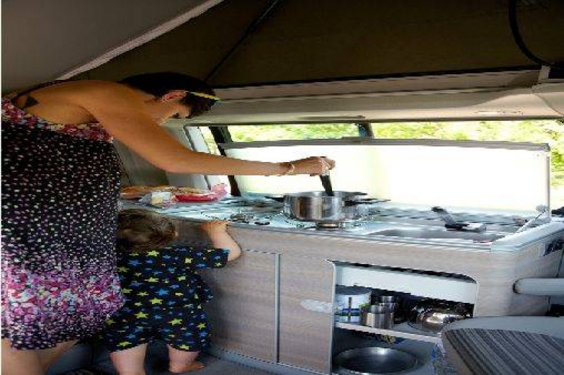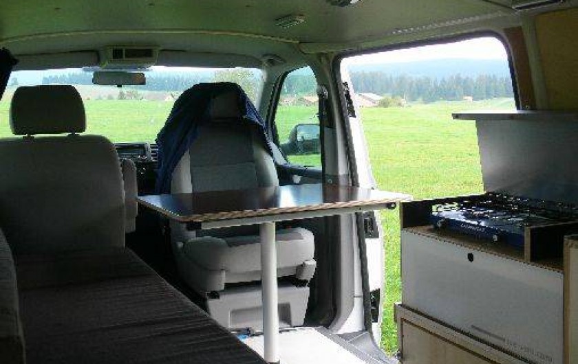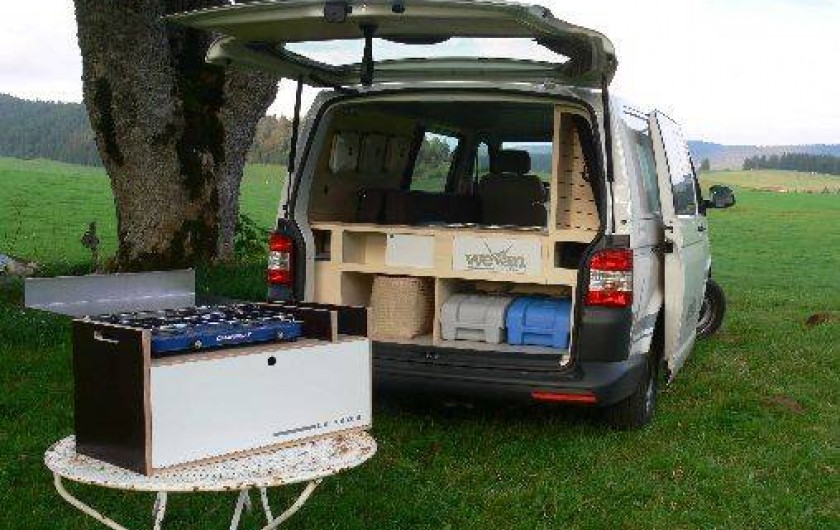 Bloc cuisine avec 2 feux gaz, évier avec réservoir d'eau, réfrigérateur à compression de 42l, placards et rangements, chauffeur stationnaire efficace permettant de profiter des sports d'hiver, 2 couchages en bas, 2 couchages en haut toit relevé, table et chaises extérieures, auvent. Le van aménagé ne lésine pas sur le confort d'habitation et vous permet d'être autonome au maximum.