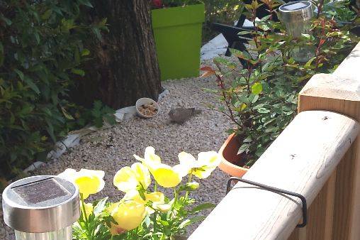 Grande terrasse ombragée avec table et fauteuils de jardin pour 8 personnes,2transats,BBQ.élect.,place de parking.