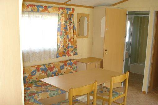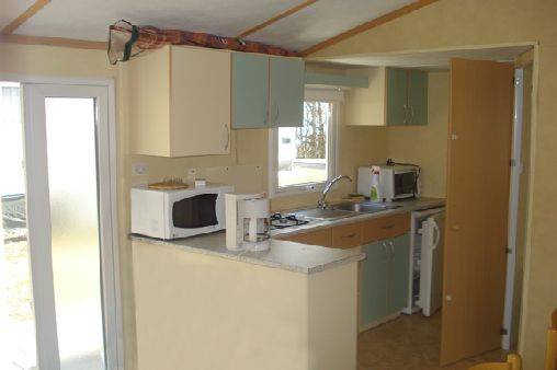 Séjour : Grand salon central avec banquette confort en (L) intégrant un lit convertible de (140x190), une table rectangulaire avec 2 chaises, TV, chauffage gaz, cuisine avec frigo de 200 litres avec freezer micro-onde, plaque 4 feux gaz, cafetière électrique, évier avec (eau chaude / eau froide), vaisselle adaptée au nombre de personnes 1 porte fenêtre entré et 2 fenêtres.