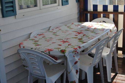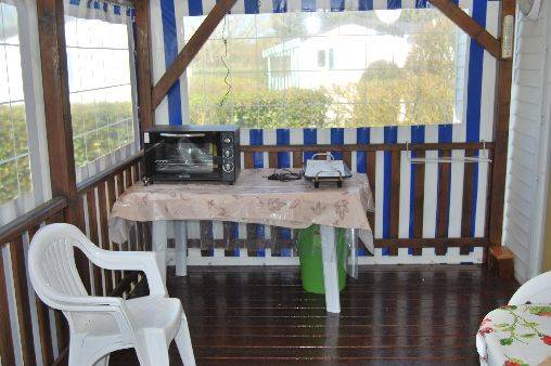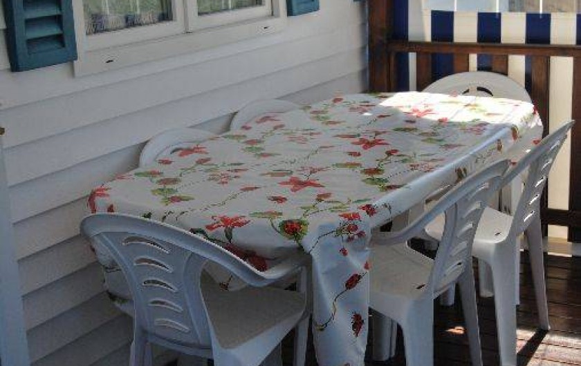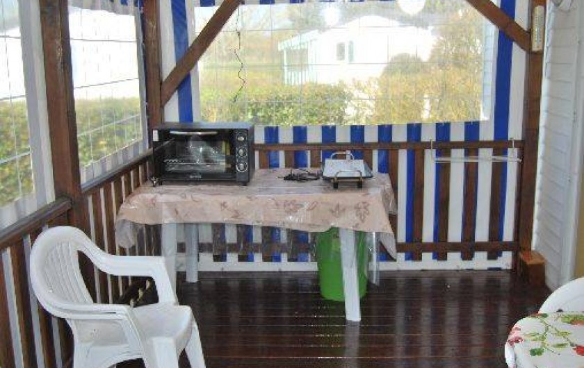 terrasse entièrement fermé, avec 1 table et 6 chaises, une 2°table pour mini four, plancha, plaque induction.