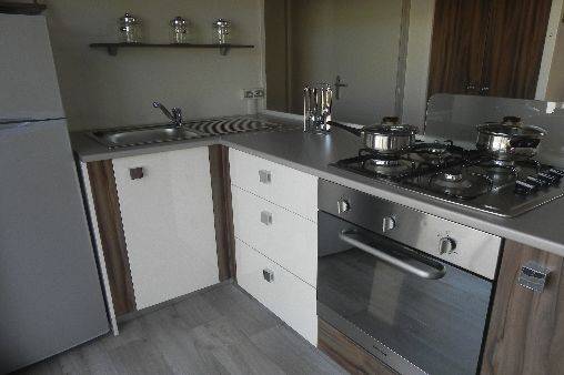Cuisine avec, four, micro-onde, cafetière électrique, bouilloire, grille pain, réfrigérateur, congélateur