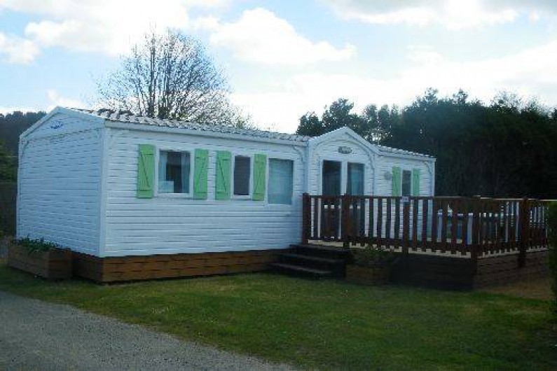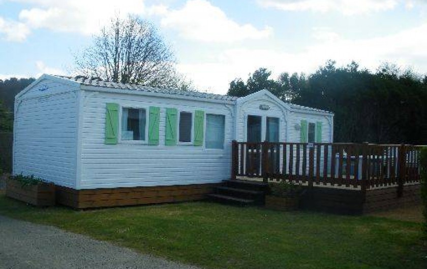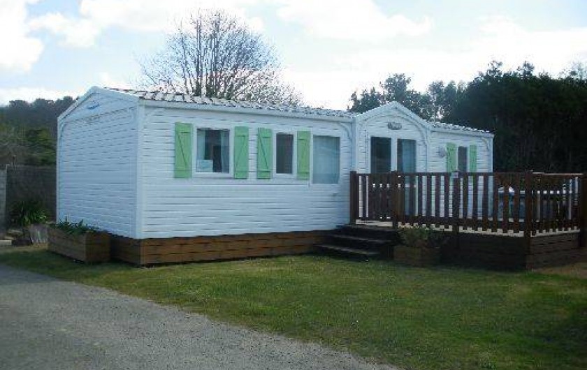 Le mobil home situé à deux pas de Perros Guirec comprend une grande terrasse (21 m2) en bois avec portail, un salon de jardin avec huit chaises et avec un parasol, un barbecue, un tancarville et un coffre de rangement. Possibilité de location d'un autre mobil home neuf sur le
