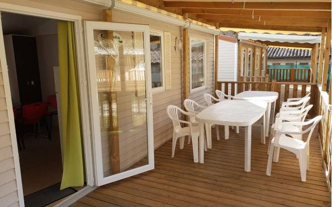 À l’ombre des acacias, nos locations de camping avec sanitaires et terrasse couverte sont aménagées et équipées pour votre plus grand confort.