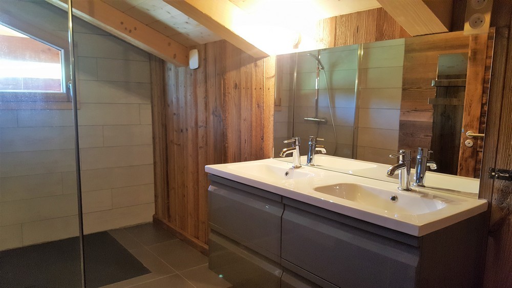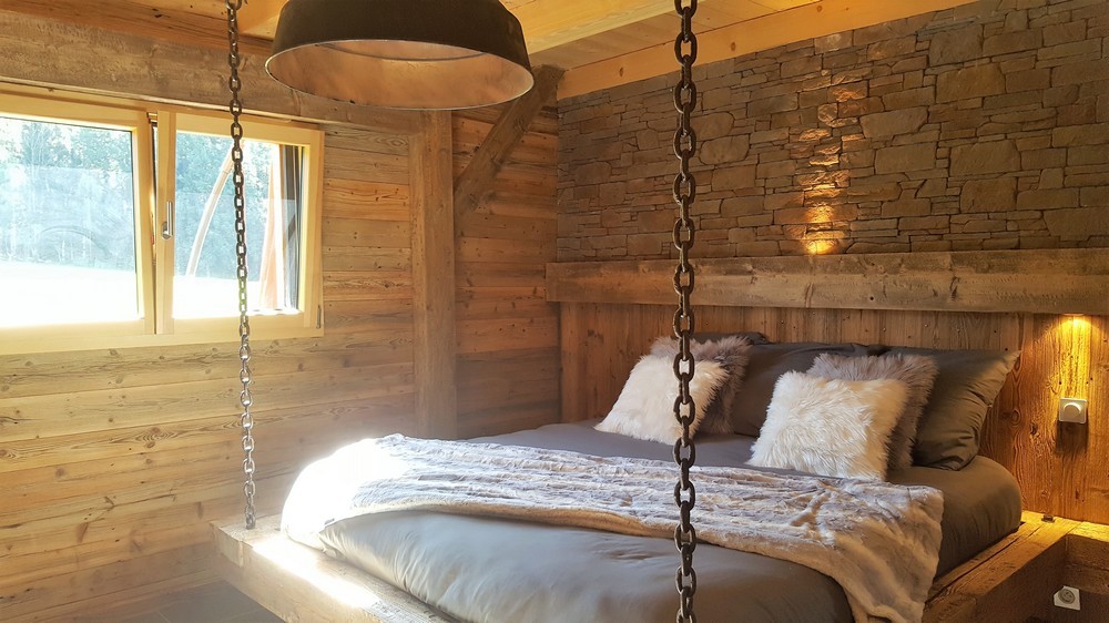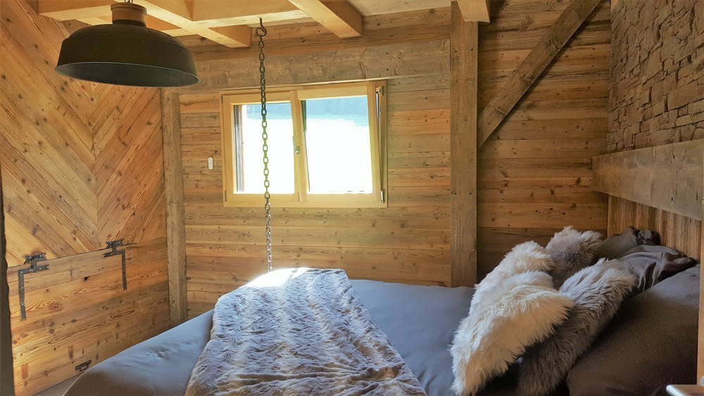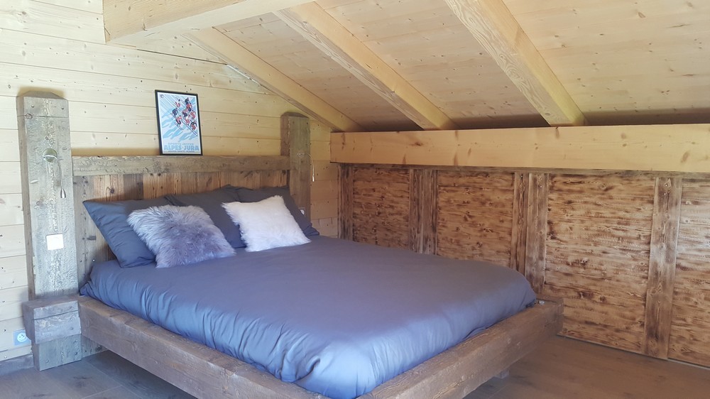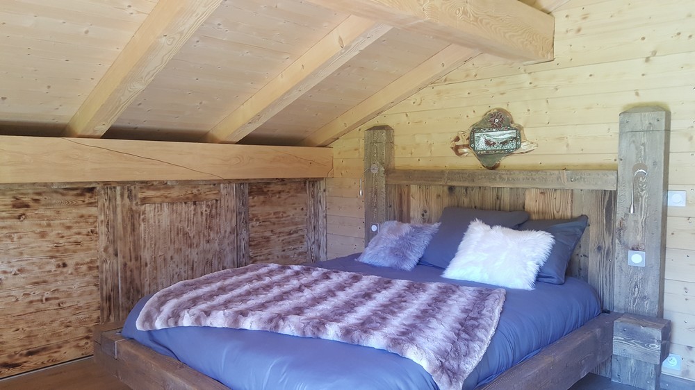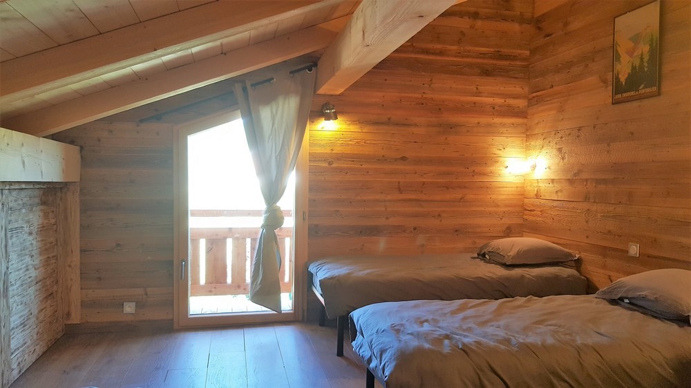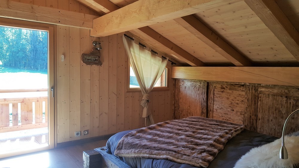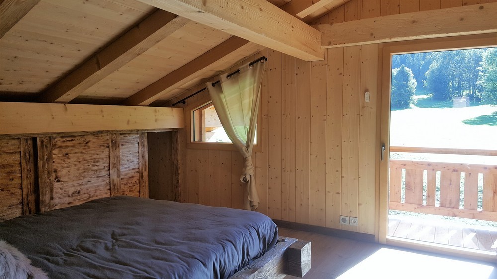 un lit de 160x200cm et accès au balcon qui donne sur l'arrière du chalet. Une troisième chambre avec 3 lits de 90x200cm, et également accès sur un balcon donnant quant à lui sur l'avant du chalet.
