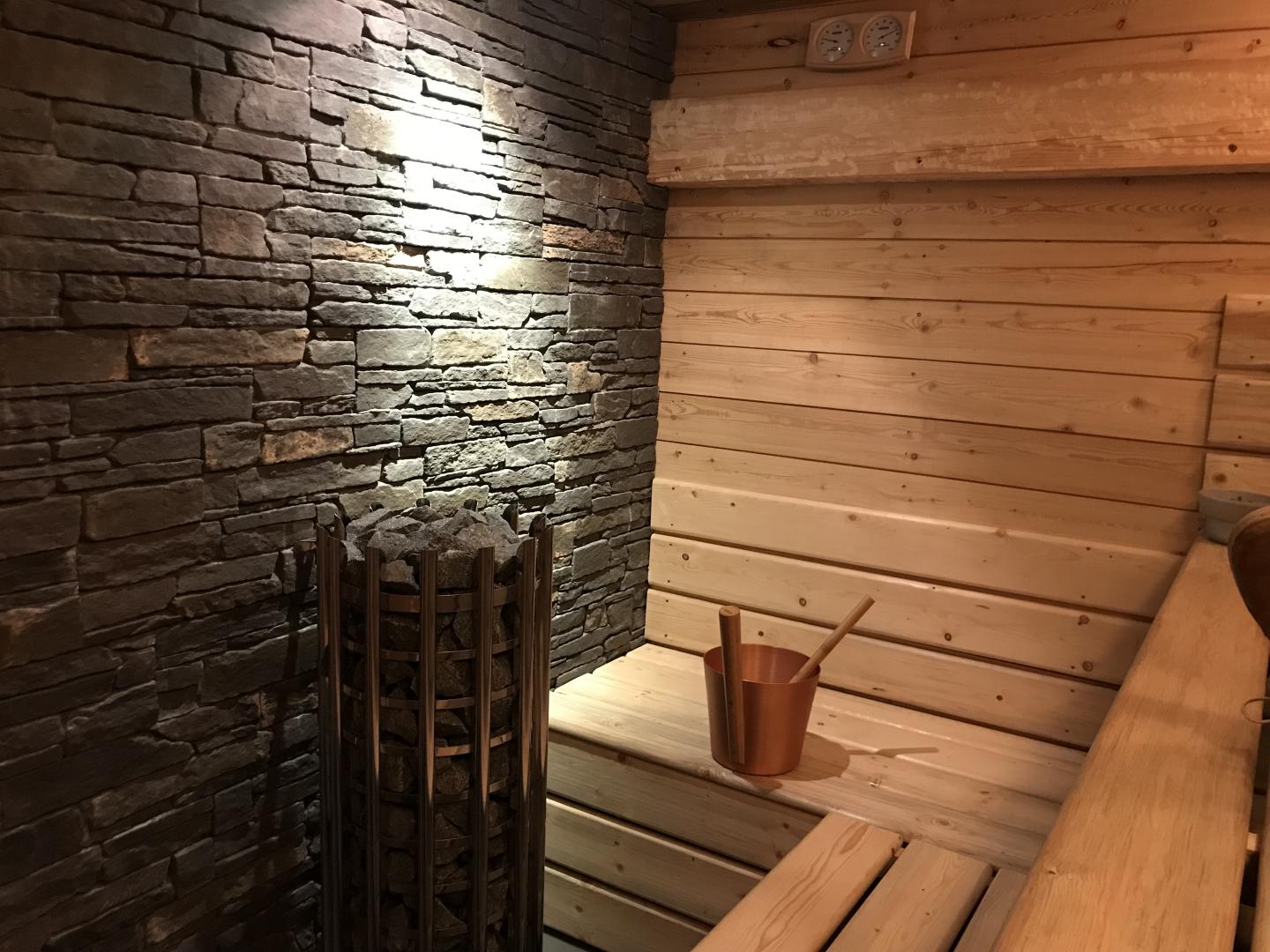 Hall d'entrée avec rangements, lave linge, sèche linge, et accès au sauna. Douche et wc indépendants. Au premier étage, magnifique pièce à vivre composée d'une cuisine équipée et d'un espace salon avec chaine hifi et télévision écran plat. Wc indépendants.