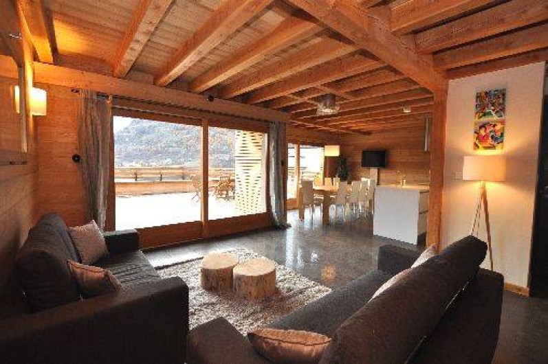 dispose d'une grande terrasse de 80 m² exposée plein sud et avec vue imprenable sur le domaine skiable de Briançon Serre Chevalier. Un grand salon avec cheminée centrale suspendue et visible depuis le coin repas et la cuisine.