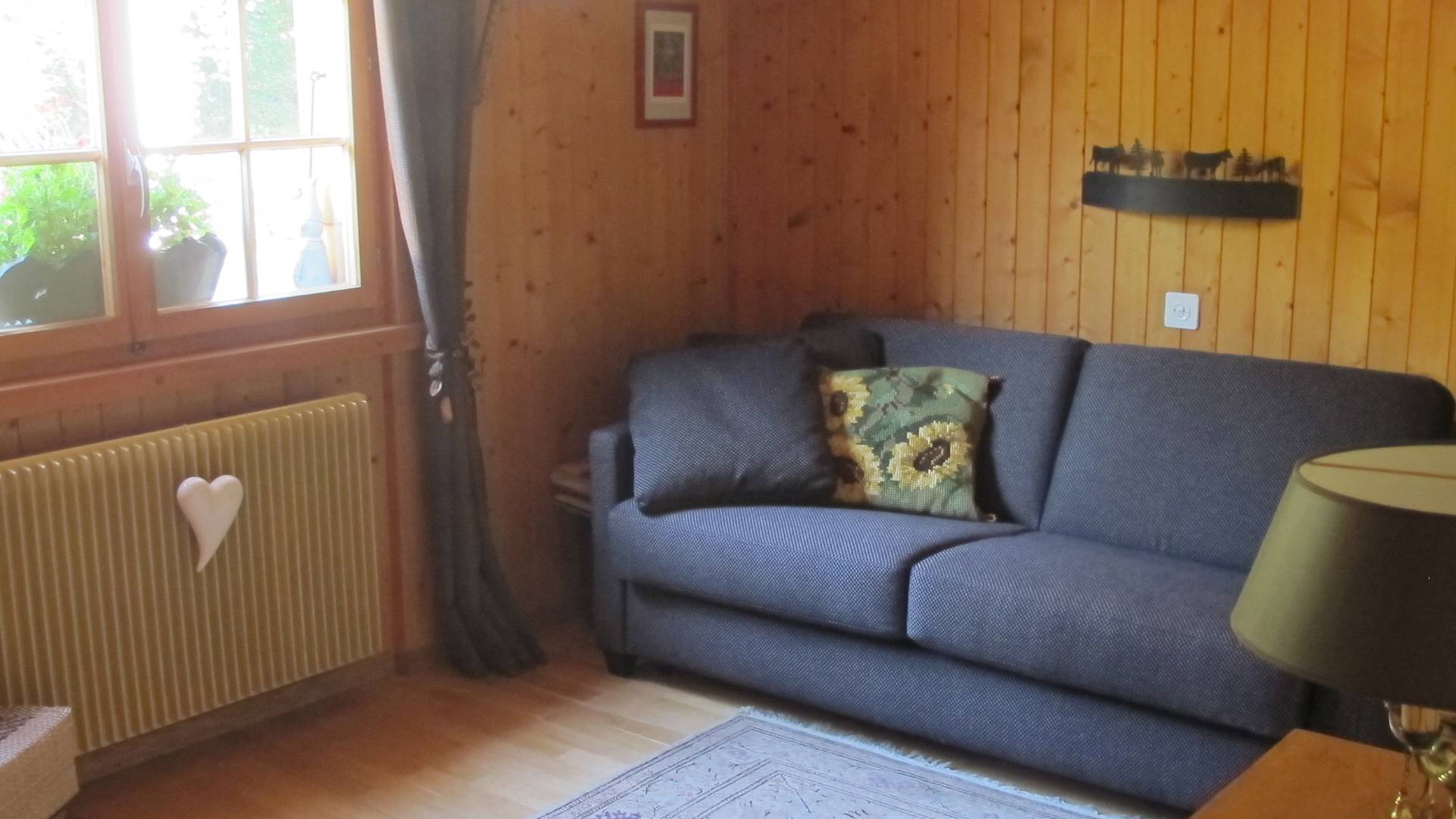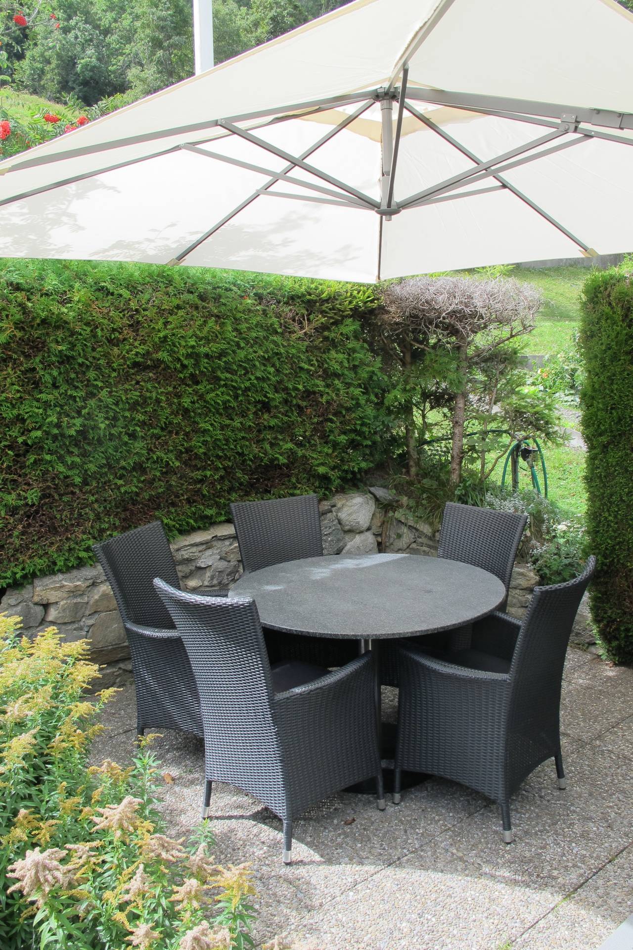 Maison entourée d'un magnifique jardin fleuri l'été ,équipé d'une coin manger et coin salon avec canapé lit, parasols.