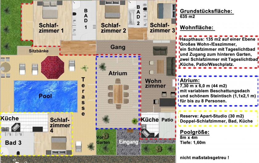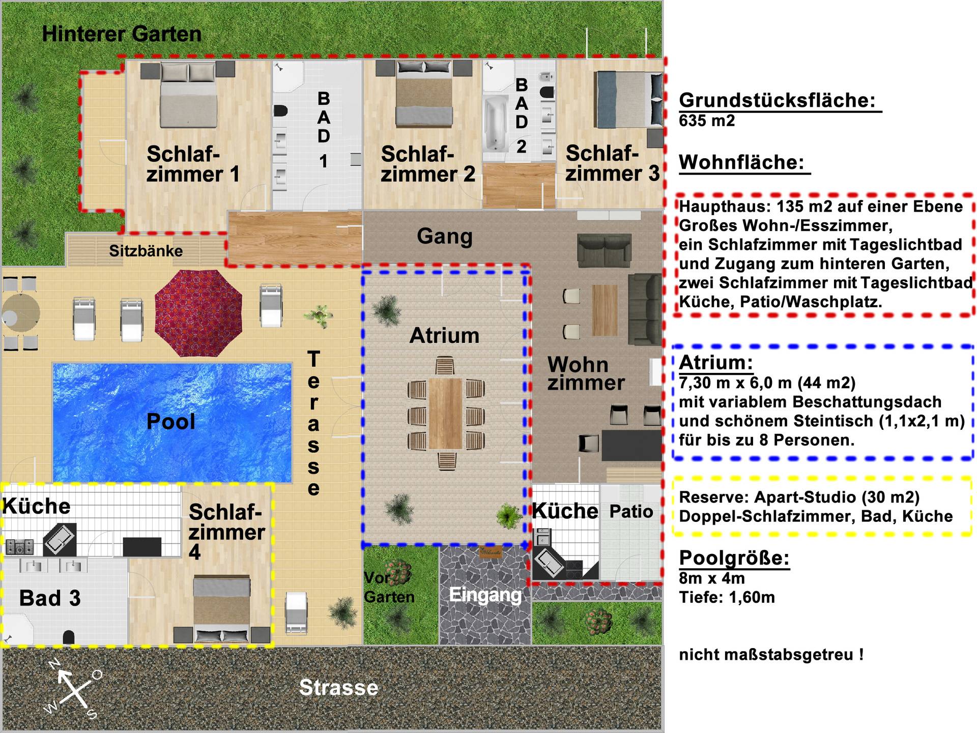 Comme toutes les chambres sont de plain-pied, la maison est également adaptée pour les personnes à mobilité réduite. Les douches sont au niveau du sol. La piscine dispose à travers une profondeur de 1. 60 m. Les enfants et les non-nageurs doivent donc toujours être surveillés. Les fêtes / événements ne sont pas autorisés. La maison est située dans un quartier résidentiel calme. Dehors, nous demandons, en ce qui concerne le volume, de prendre en considération les voisins et de ne pas utiliser la piscine la nuit ou tôt le matin au coucher.