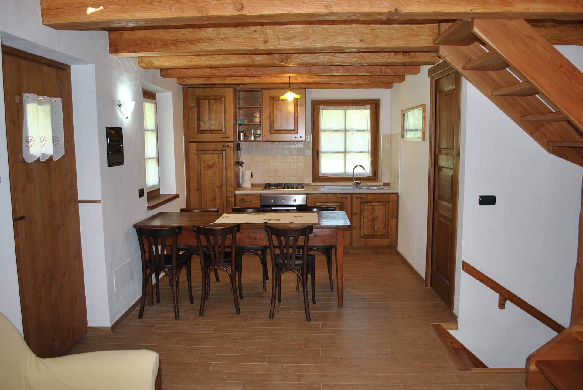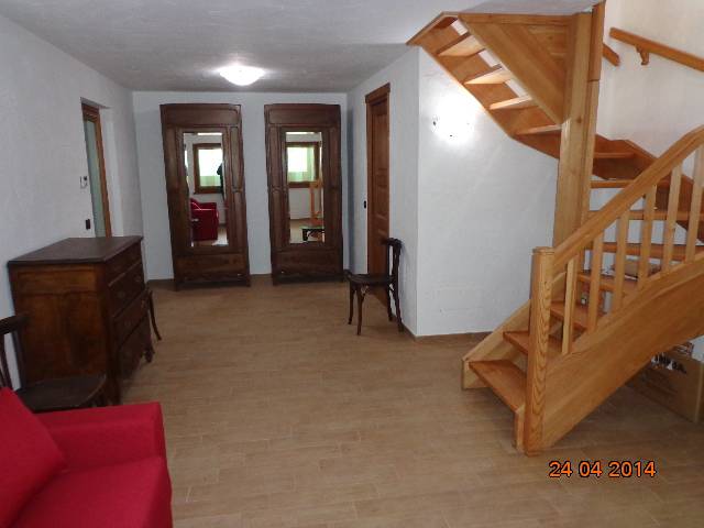 escalier qui monte à la porte pas très élevé avec un toit exposé loft, qui détient un gand lit et deux lits simples, le même escalier descend au sous-sol où il y a une grande chambre avec un canapé-lit 2 armoires, commode et une deuxième salle de bains avec douche et une cavité qui agit comme un sous-sol pour la maison, at l'exterieur le vert tout autour maison. Le chalet est équipée avec tout sauf pour la télé (il y a une attaque), nous ne fournissons pas les draps (draps et serviettes) et les bois / pellets pour le chauffage. La propriété est chauffée par un poêle à bois situé dans le salon, un poêle à granulés, qui est situé dans le sous-sol et un système de chauffage au sol électrique.