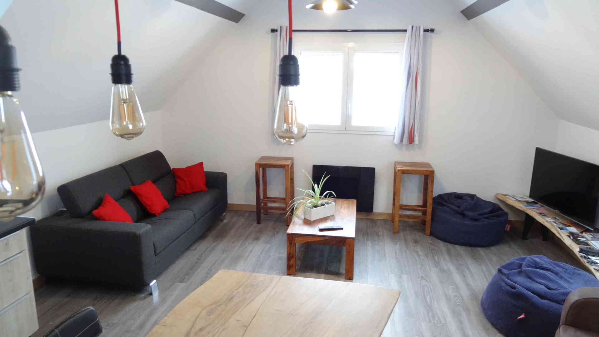 Le gîte Cassiopée 60 m² est adapté PMR (1 fauteuil), l’ensemble peut accueillir jusqu’à 4 pers. Le canapé convertible offre 2 couchages d'appoint supplémentaires