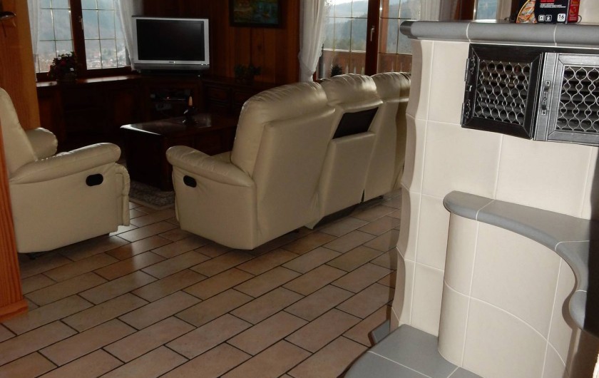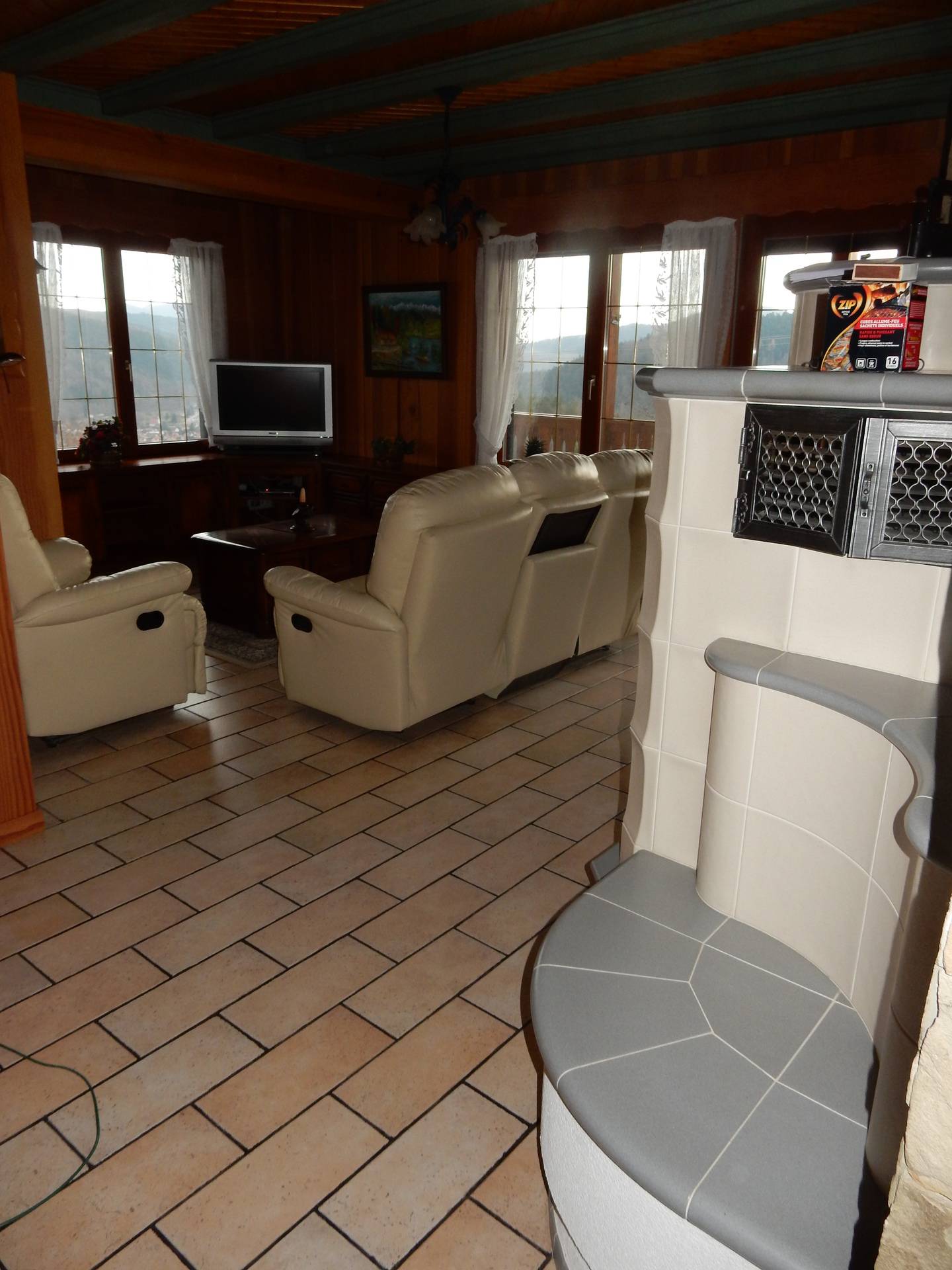 Le gîte entièrement équipé comprend au deuxième niveau au-dessus du garage, un agréable séjour équipé d’un authentique « kachelofen », une chambre, une cuisine, un coin repas, une salle de bains