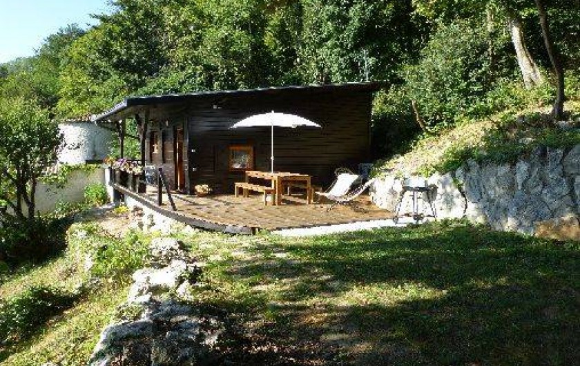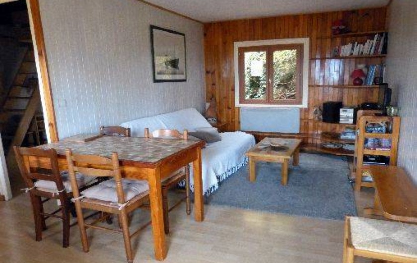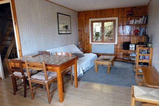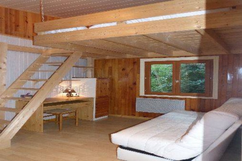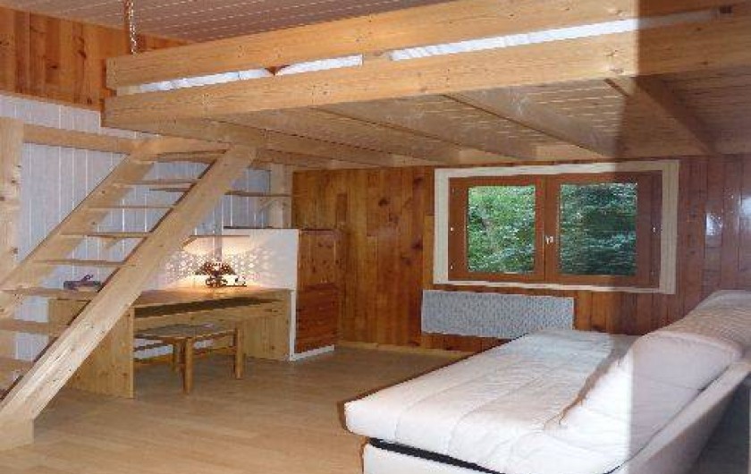 Ce chalet comprend une pièce de séjour / cuisine américaine (avec un canapé convertible 2 places), une chambre (lit 2 places en mezzanine + canapé convertible 2 places), et une salle d’eau équipée d’une cabine de douche, d’un lavabo et de toilettes + une terrasse bois de 25m2 avec table, transats et barbecue, et d’un local permettant de stocker skis ou vélos.